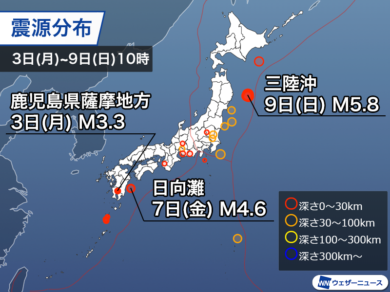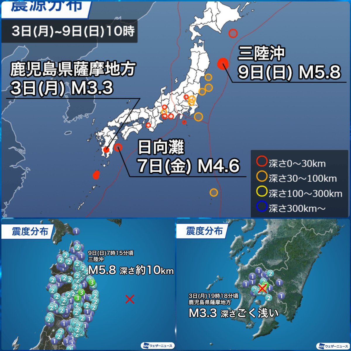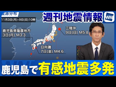 【週刊地震情報】 3日(月)の夕方から夜に、鹿児島県薩摩地方で有感地震が多発しました。桜島や霧島山からは少し離れていて、火山活動と直接関連するような地震ではないとみられます。 また、今朝は三陸沖で地震が頻発しています。 weathernews.jp/news/202511/09… pic.x.com/pi2KNrhosm