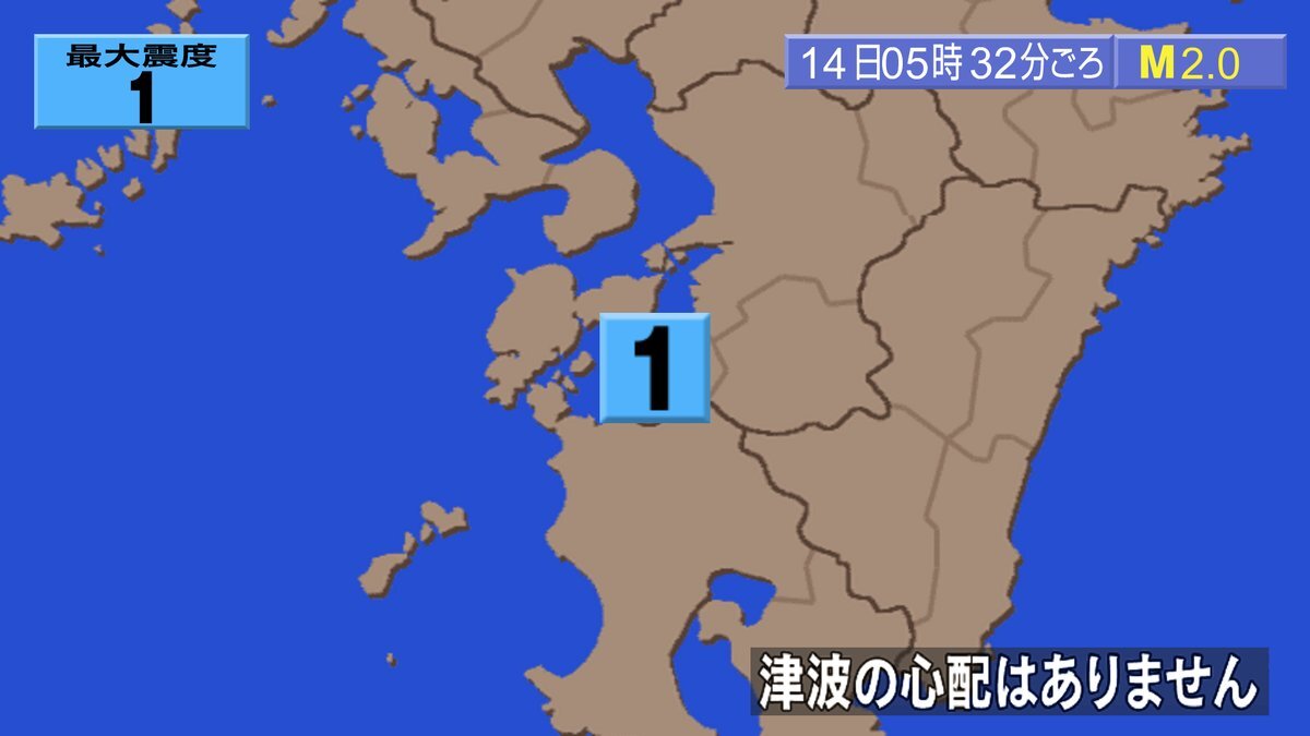 【地震情報】 14日05時32分頃、鹿児島県薩摩地方で最大震度1の地震がありました。震源の深さはごく浅い、地震の規模はM2.0です。 震度1: [熊本県] 水俣市 この地震による津波の心配はありません。