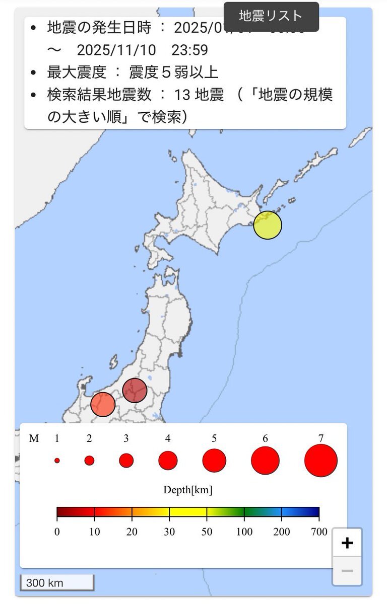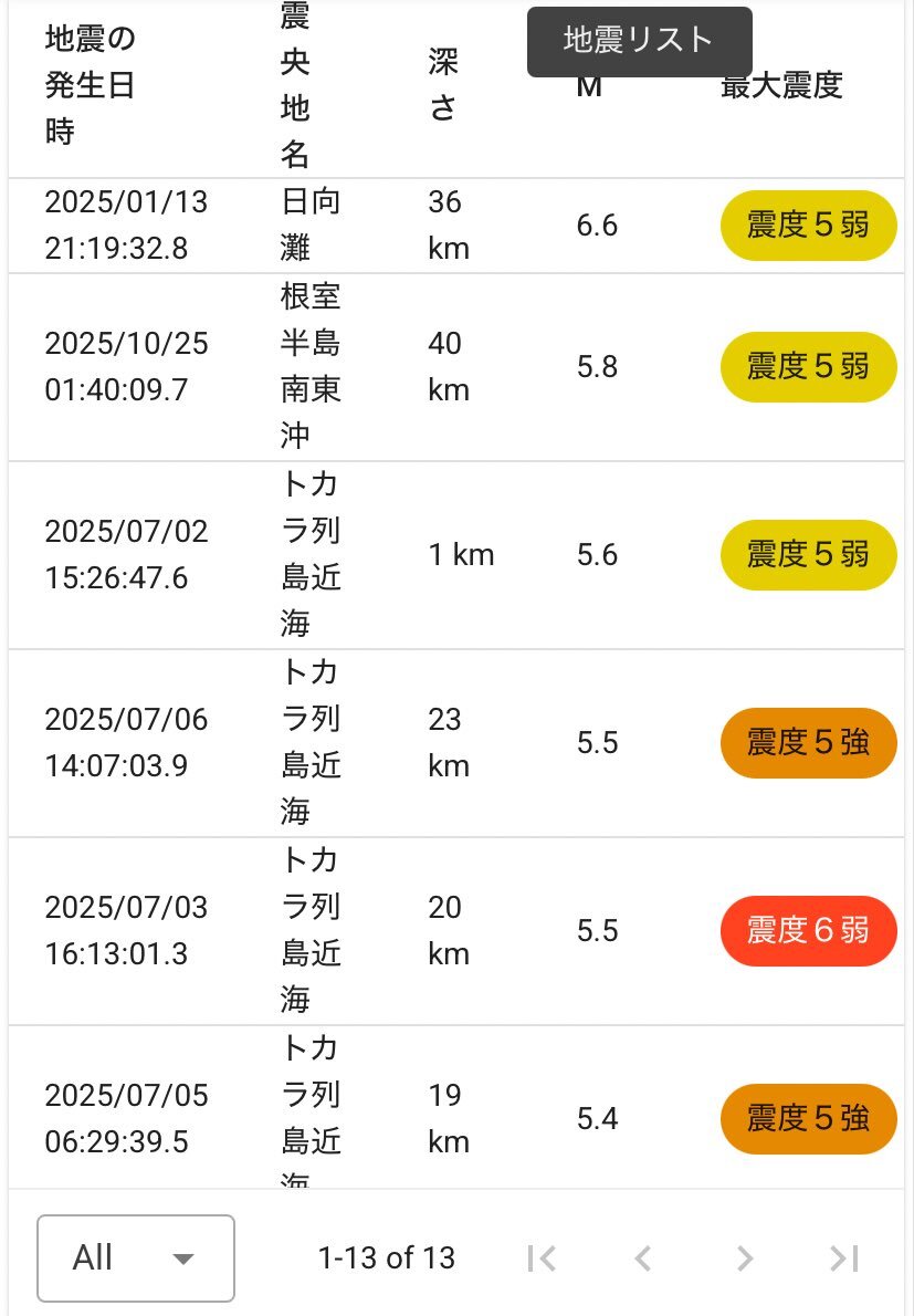 2025年日本国内の震度5弱以上の地震は13回発生しています 日向灘M6.6以降、M5.0からM5.9の中規模地震が複数回発生しています 北海道太平洋側、東北地方三陸沖、鹿児島県トカラ列島ではM5.0からM5.9の中規模地震が発生しやすくなっています pic.x.com/hpMgfuA9qv