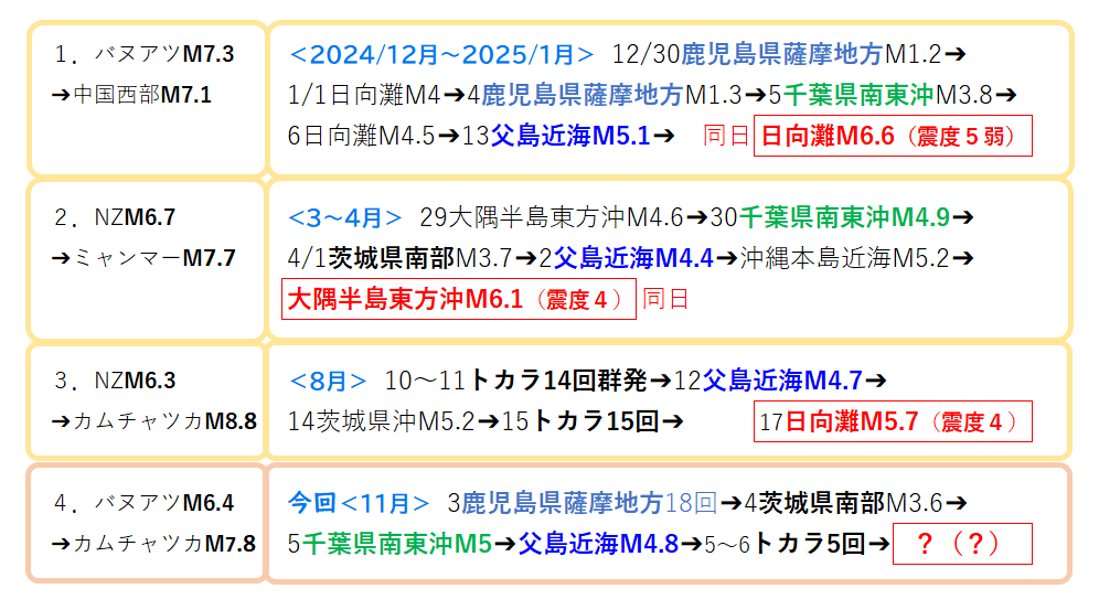 (続き) ★バヌアツ、NZ各トリガーからの九州方面M6絡み以上に関して地震の流れにパターンあり ★その中で「父島近海M4級」が起きると日向灘や鹿児島県東方沖は同日~10日以内程度となる可能性も ★今回もM6級以下なら震度5程度の揺れだけ終了もM7以上の場合は多々影響も? x.com/SS7S11/status/… pic.x.com/WzuINBafAO