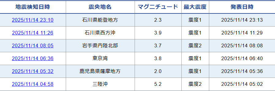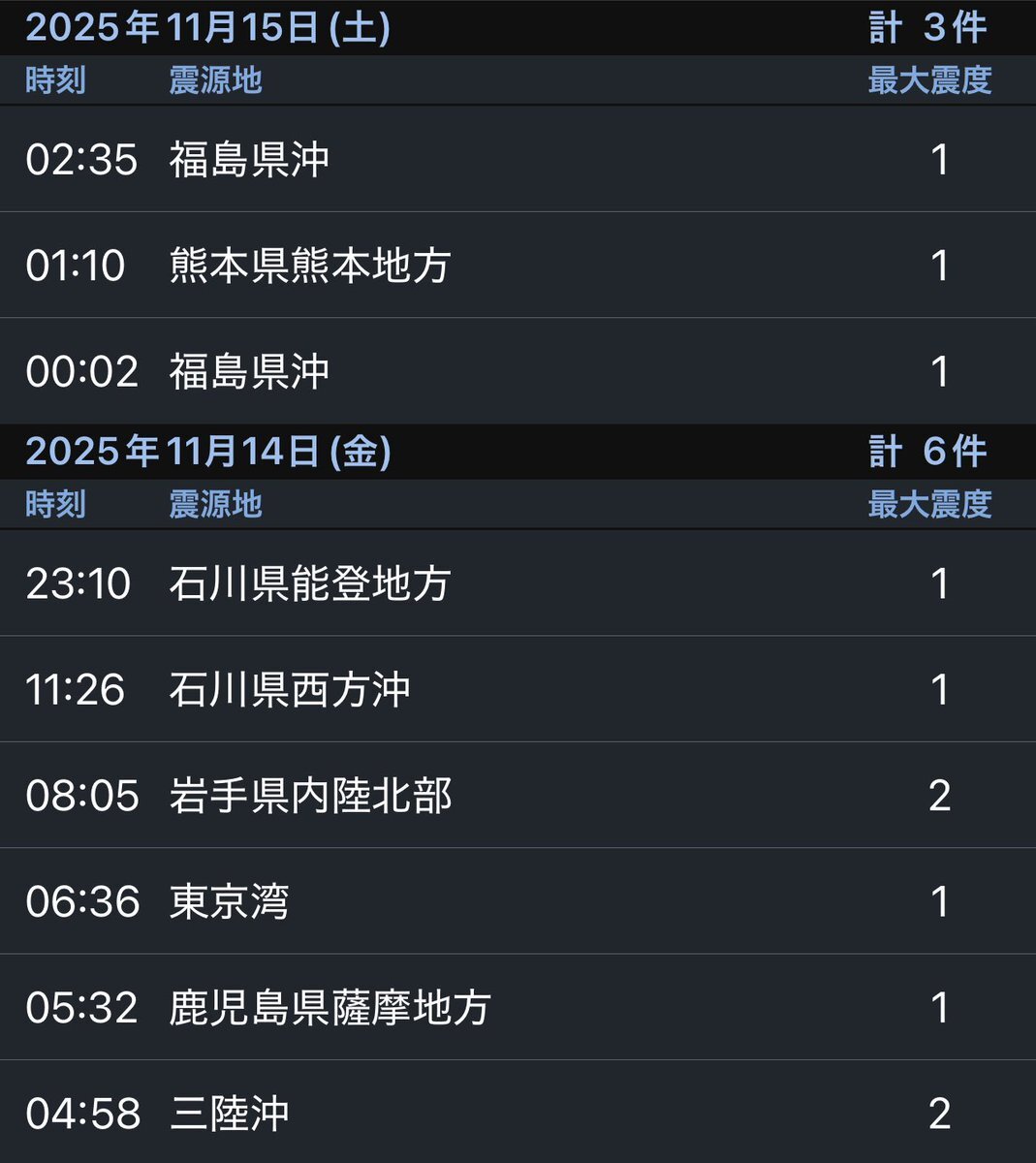 【地震情報 2025.11.14】 𝟐「三陸沖」 𝟐「岩手県内陸北部」 𝟏「鹿児島県薩摩地方」 𝟏「東京湾」 𝟏「石川県西方沖」 𝟏「石川県能登地方」 #気象庁 data.jma.go.jp/multi/quake/in… pic.x.com/UrvTcWMba5