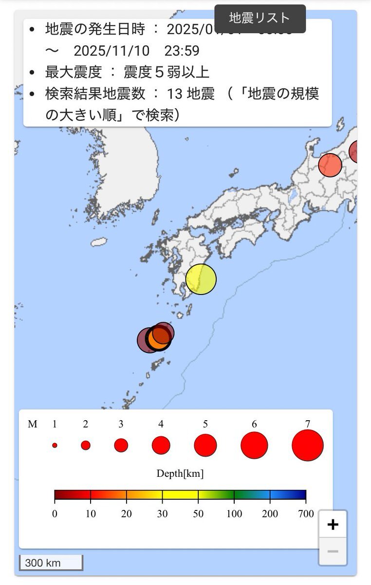 ◆地震情報◆ 発生時刻 2025/11/10 00:30 震源地 トカラ列島近海 最大震度 1 マグニチュード 2.3 深さ 20km この地震による津波の心配はありません。 [各地の震度] ▽震度1 【鹿児島県】鹿児島十島村