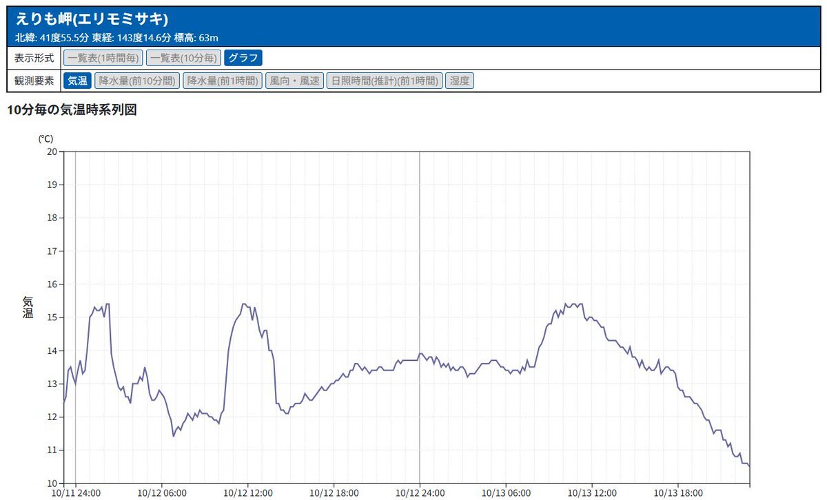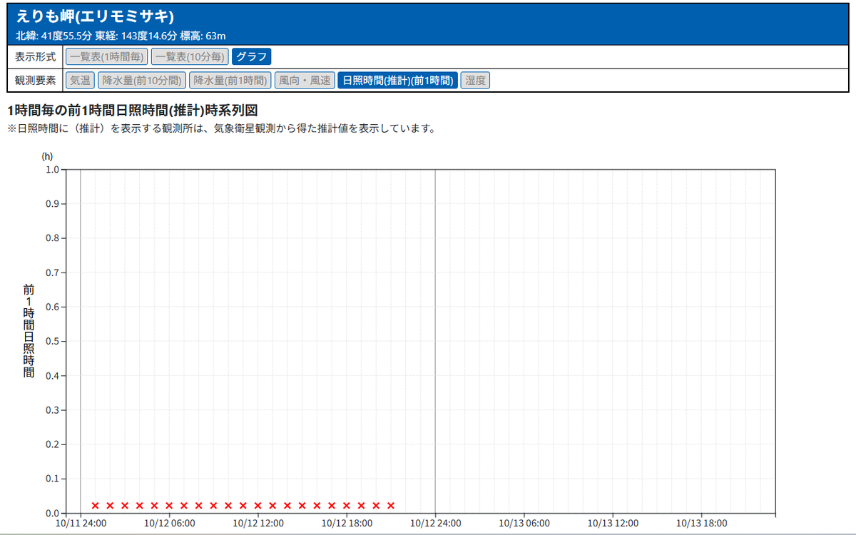 ここ2日間のえりも岬アメダス、最高気温は昨日15.6℃、今日は15.7℃でした。13日連続でランク外です。 昨日は雨一時曇り、今日は雨のち曇りでした。昨日は日照時間に欠測があり、全国的なのでひまわり9号の通信障害の影響でしょう。 台風があっても風のランキング入りしました。 #えりも岬アメダス pic.x.com/9OlC8jrvmU