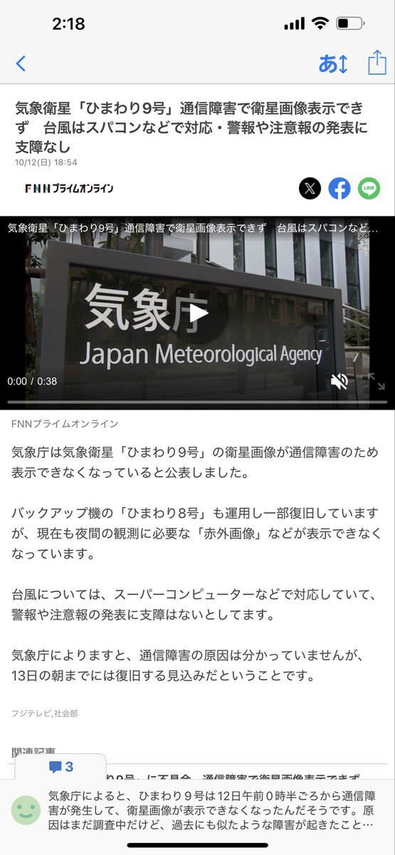 2025年10月12日午前6時45分 気象衛星の観測に障害 “台風観測に大きな影響なし”気象庁 | NHKニュース 【NHK】気象衛星「ひまわり9号」の観測に障害が発生し、気象庁のホームページ上で雲の画像が正常に表示できなくなっています。 news.web.nhk/newsweb/na/nb-…