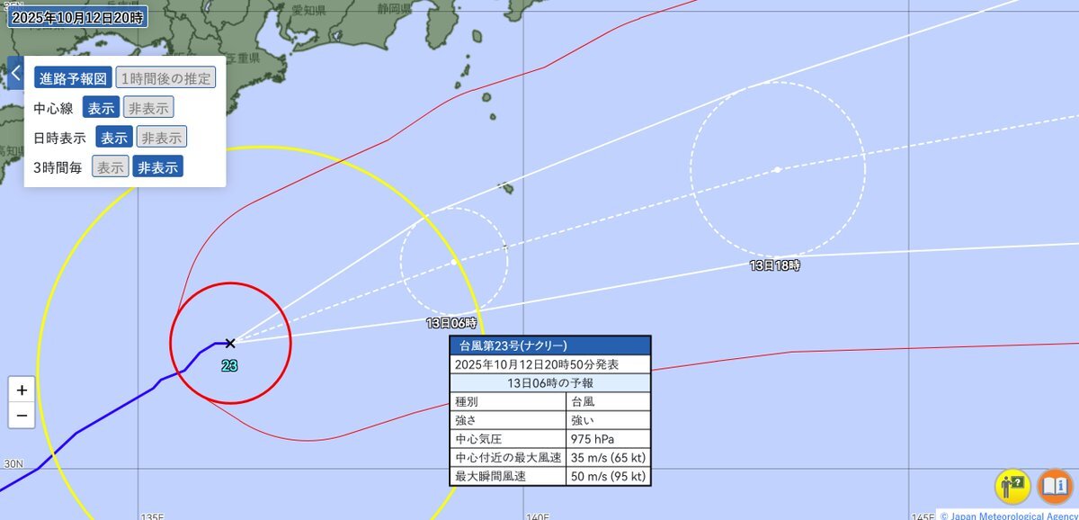 ひまわり9号故障の件はひまわり8号のバックアップが軌道に乗ったけど、台風23号は確実に伊豆諸島南部へ近付いている。 今回も青ヶ島付近が予報円の中心。明日の朝~昼前が最接近か。 大変だ…😱😱 pic.x.com/98ht4bHcSu