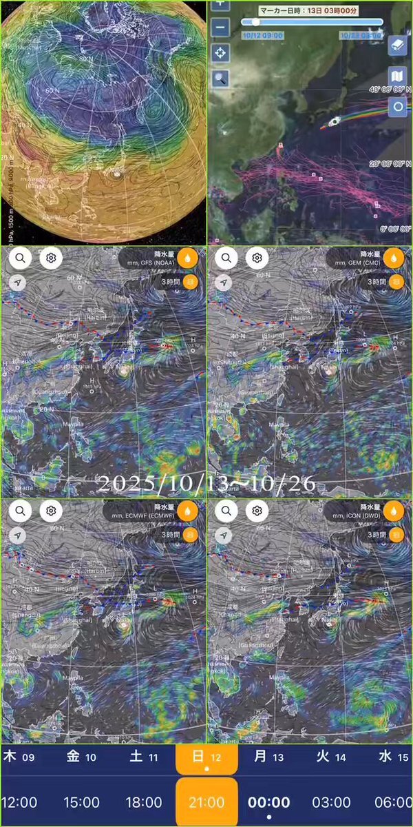台風23号 ナクリー Nakri 2025/10/13~のVentusky.com によるNOAA GFS 14日間 1500m寒気+ GPV 各国台風進路予測 + GFS GEM ECMWF ICON 降水量 地上風速。#台風23号 #ナクリー #Nakri 台風24号兆候 前日→ x.com/kishogyotakush… 。 x.com/kishogyotakush…