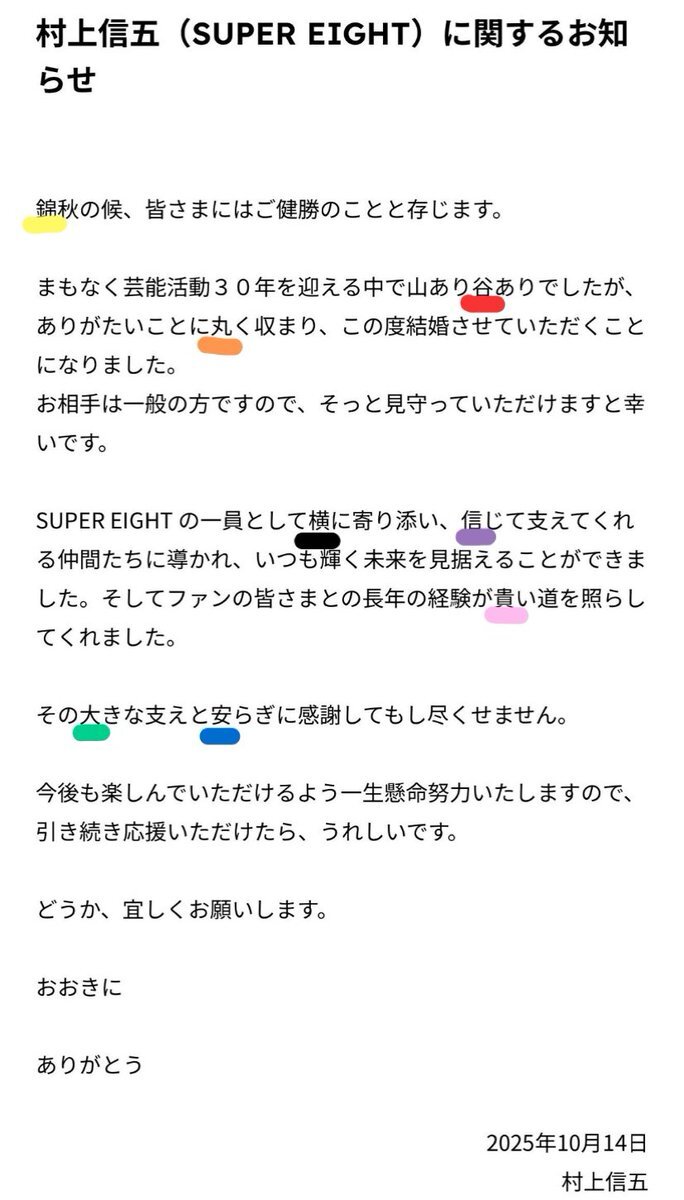 村上信五さんが結婚したという情報がSNSで拡散されています。結婚相手は一般の方であるとされています。投稿の中には、結婚報告文に8人の名前が1文字ずつ入っていることや、結婚記念日が同じという内容のものも見られます。