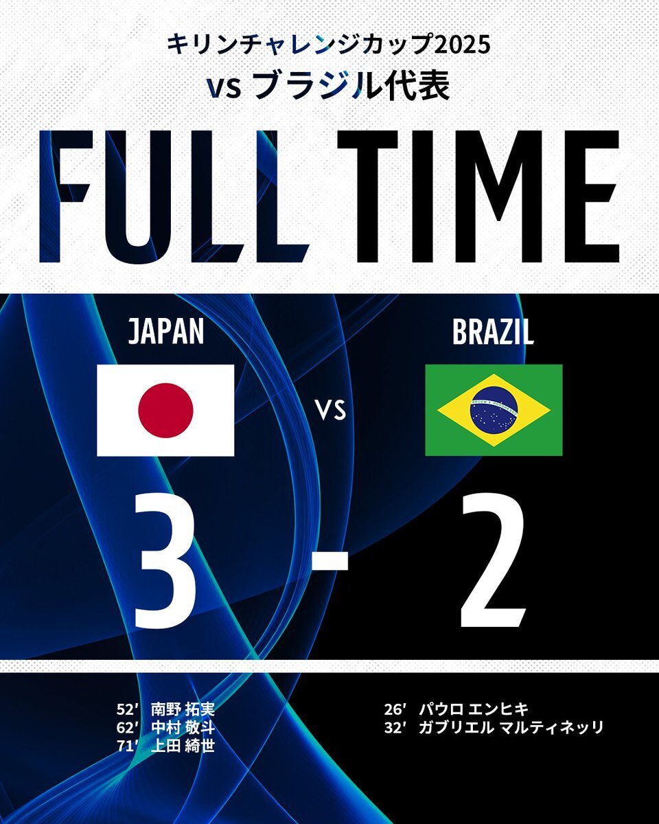 サッカー日本代表とブラジル代表の親善試合が行われ、日本代表がブラジル代表に勝利しました。試合は前半2-0とブラジル代表がリードしていましたが、後半に日本代表が逆転し、3-2で勝利しました。