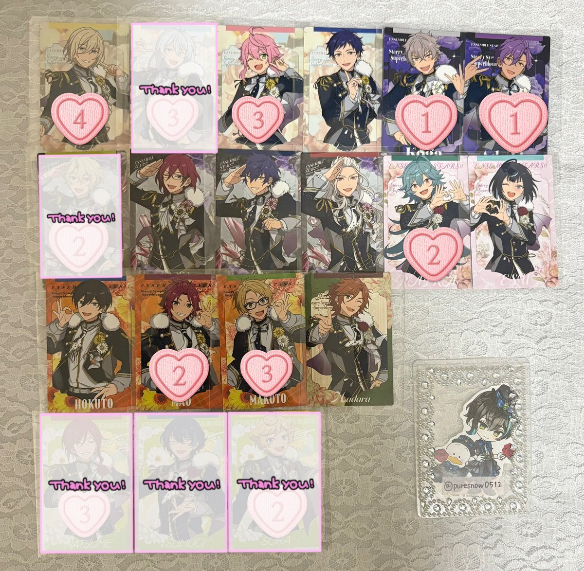 2025年11月15日、Twitter上で「あんスタ スタフォニ」のカード、ミニペンライト、ハート缶バッジなどの交換・譲渡に関する投稿が多数見られました。ユーザーは自身の所持カードやグッズを提示し、希望するアイテムを交換または譲渡を求めています。交換条件や希望するアイテム、手渡しや郵送の希望など、詳細な情報が記載されています。