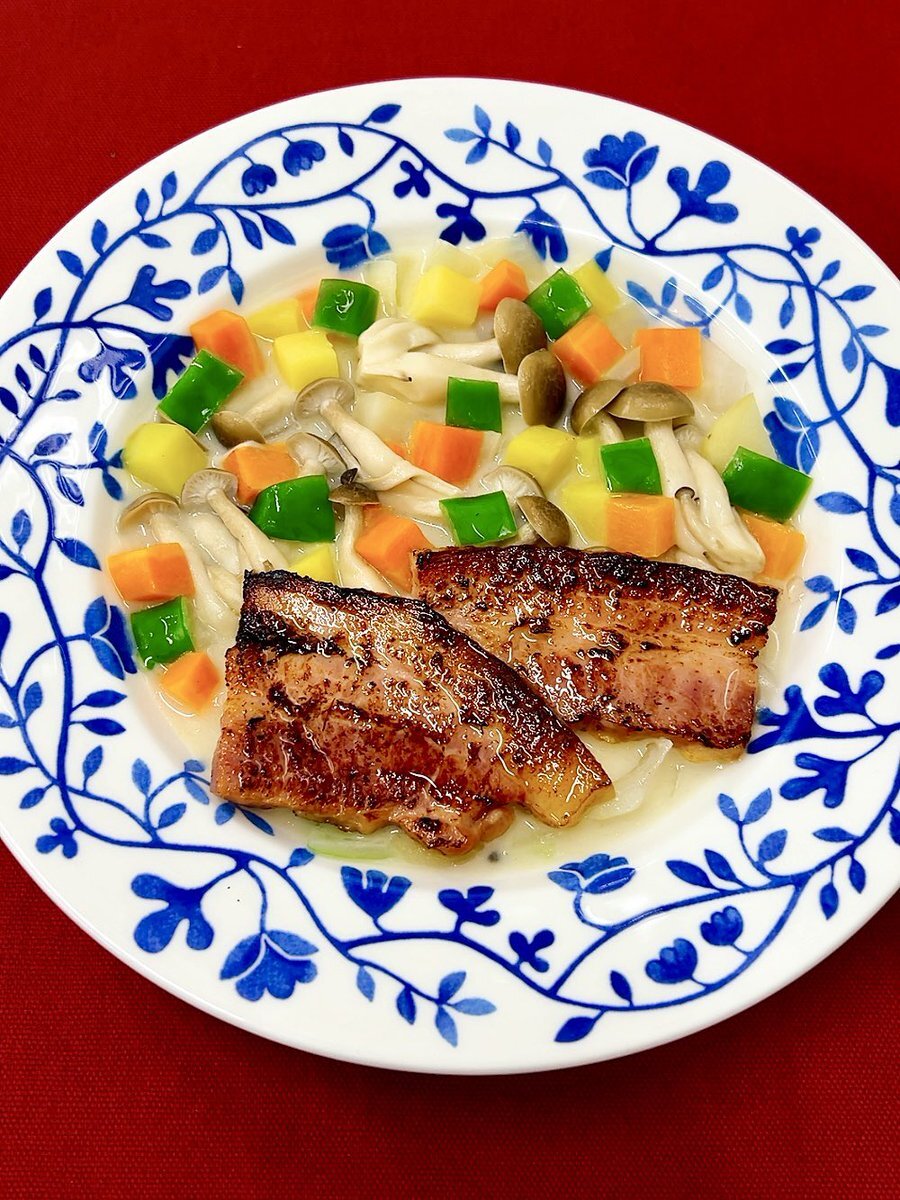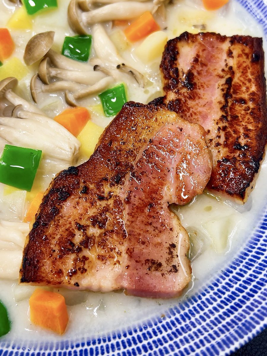 厚切りベーコンときのこのチャウダー🍄 水と牛乳を多めにして、チャウダー風の完成だよ😃 ❶厚切りベーコンを焼いて取り出す ❷角切りのじゃが芋、人参、玉ねぎを炒める ❸水と牛乳、しめじ、ピーマンを入れる ❹シチューの素で味付け。ベーコンを乗せる #おうちごはん #料理好きな人と繫がりたい pic.x.com/E26QzGqxyl