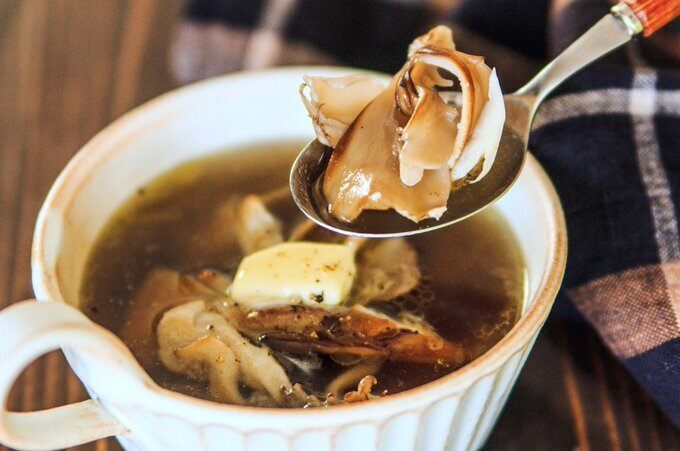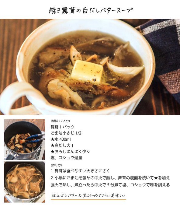 秋になると食べたくなるきのこの美味しいスープ。 舞茸をこんがり焼いて白だしとちょっとのにんにくで味付けするとすごく美味しい。仕上げにバターと黒コショウをぜひ。 pic.x.com/b5A4bTWw1b