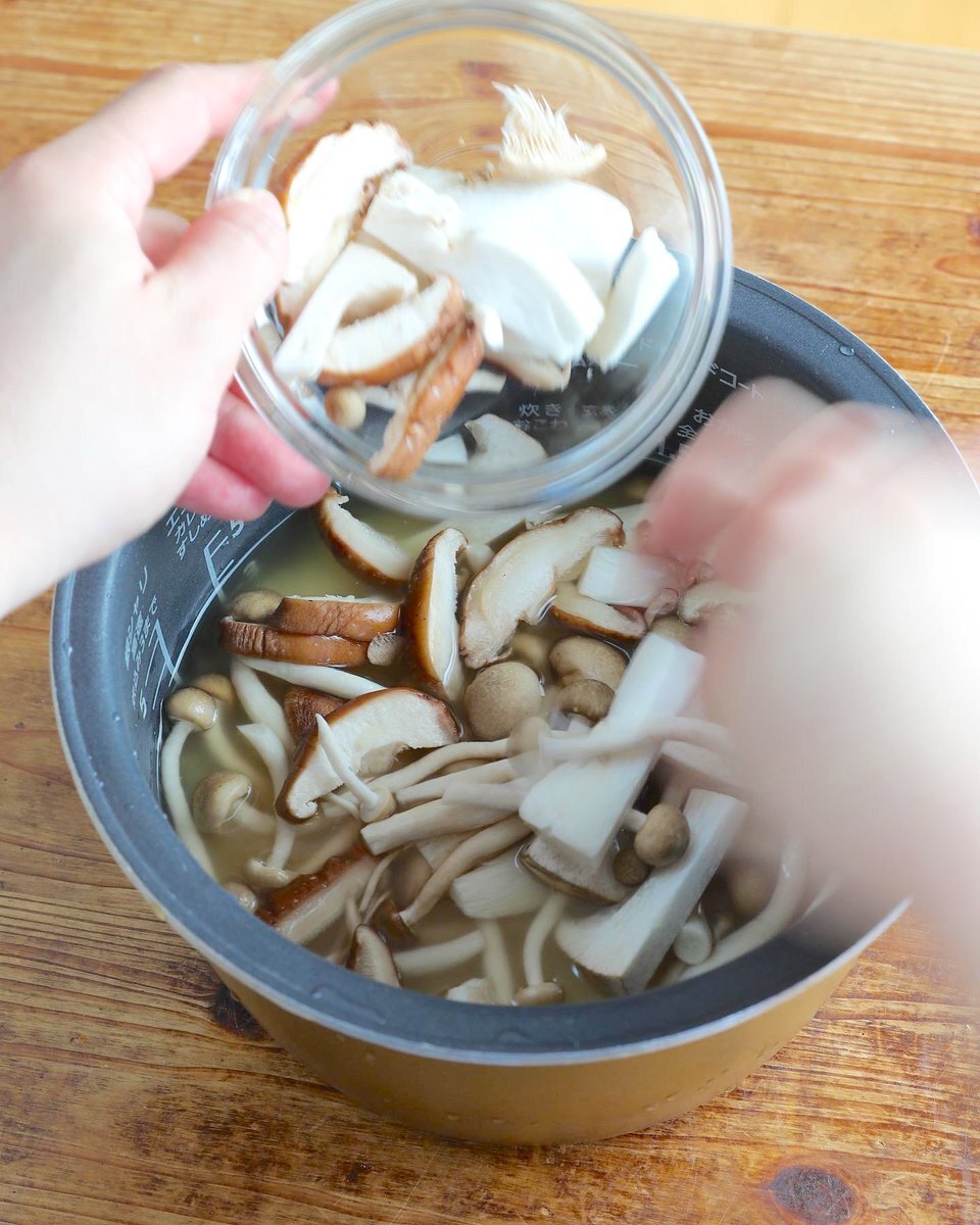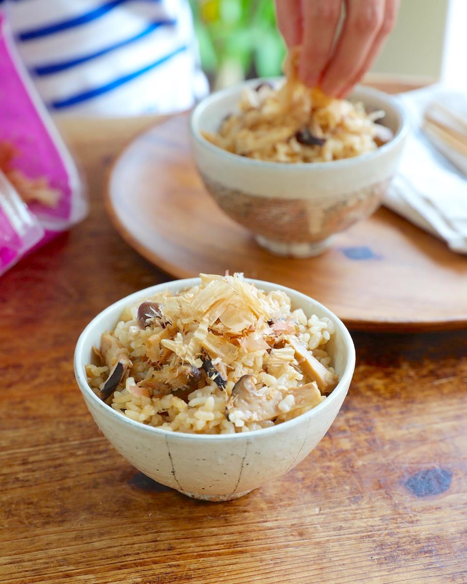 【下準備】 きのこは石づきを取って、手でほぐす。米は洗う。 ①炊飯器に、米、【A】を入れ混ぜ、目盛りまで水を入れる。きのこミックスを入れ、炊飯する。 ②炊飯後にかつお節を入れ混ぜる。お椀に盛り、花かつおをのせ、しょうゆをお好みで適量(分量外)かける。