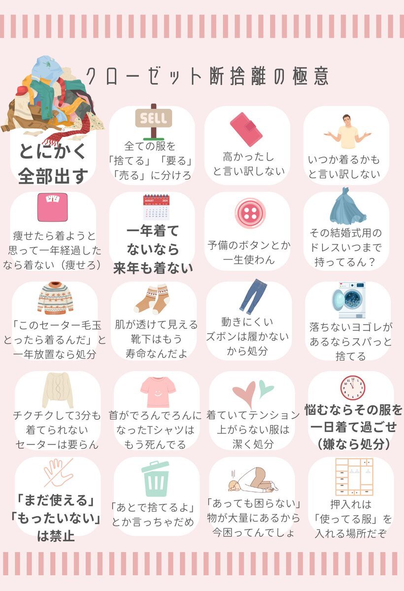だいぶ涼しくなってきたし、 衣替えついでにごっそり夏服を断捨離する人も多いだろうから 自分用に作った「服の断捨離の極意」、流しときますねっ(*ノ・ω・)ノ⌒。ソォイ!!! pic.x.com/NAYIQmC0p5
