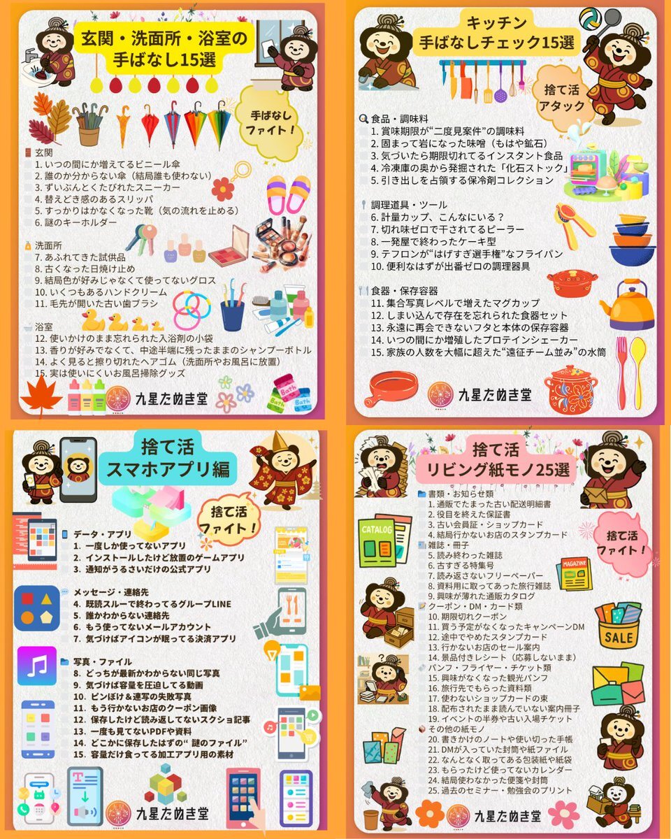 モノをへらせば9割掃除は終わったようなもの。わかっているけど断捨離の道は険しいので「即捨てできるもの25選玄関編」を作成しました!あるものは捨て、なければチェックをして15分で25項目無心でやってみて。年末までにおうちがスッキリパワースポットに。幸運をよびこむ玄関にぴったりの言葉は↓ pic.x.com/vUQEdLvYHU