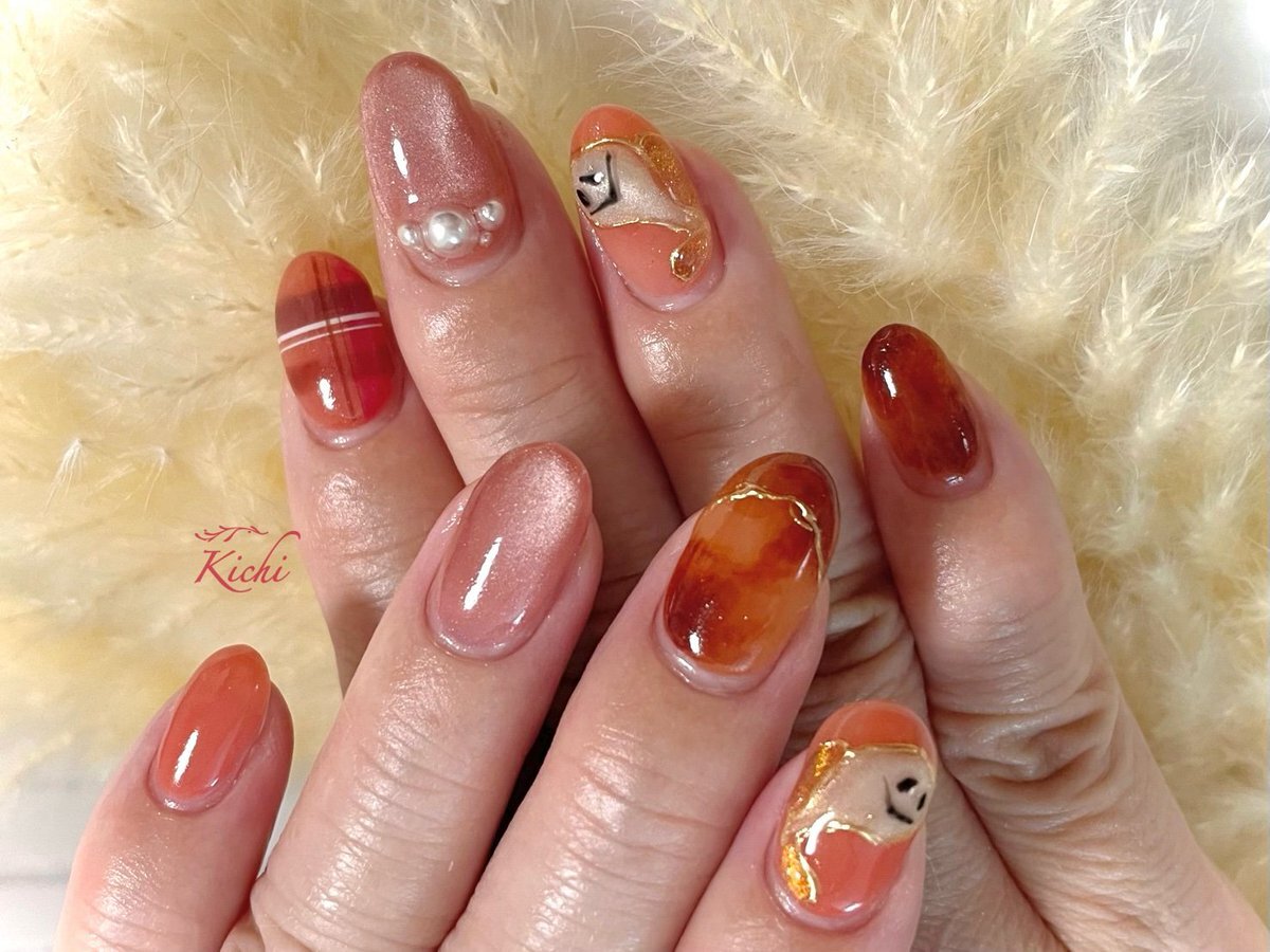 2ヶ月楽しんだJBネイルにおわかれして、べっ甲柄やチェックの秋ネイルへ。 ネイリストさんに「JBもソロコンも終わって、もう抜け殻です‥」と話したら「じゃあ、魂の抜けたおばけちゃん👻を乗せますか。ハロウィン月だし」ということで👻付き🤭。 親指のリボン型にポコっとさせた押し花もお気に入り🍀 pic.x.com/wjp8lYXQGF x.com/pomechin/statu…