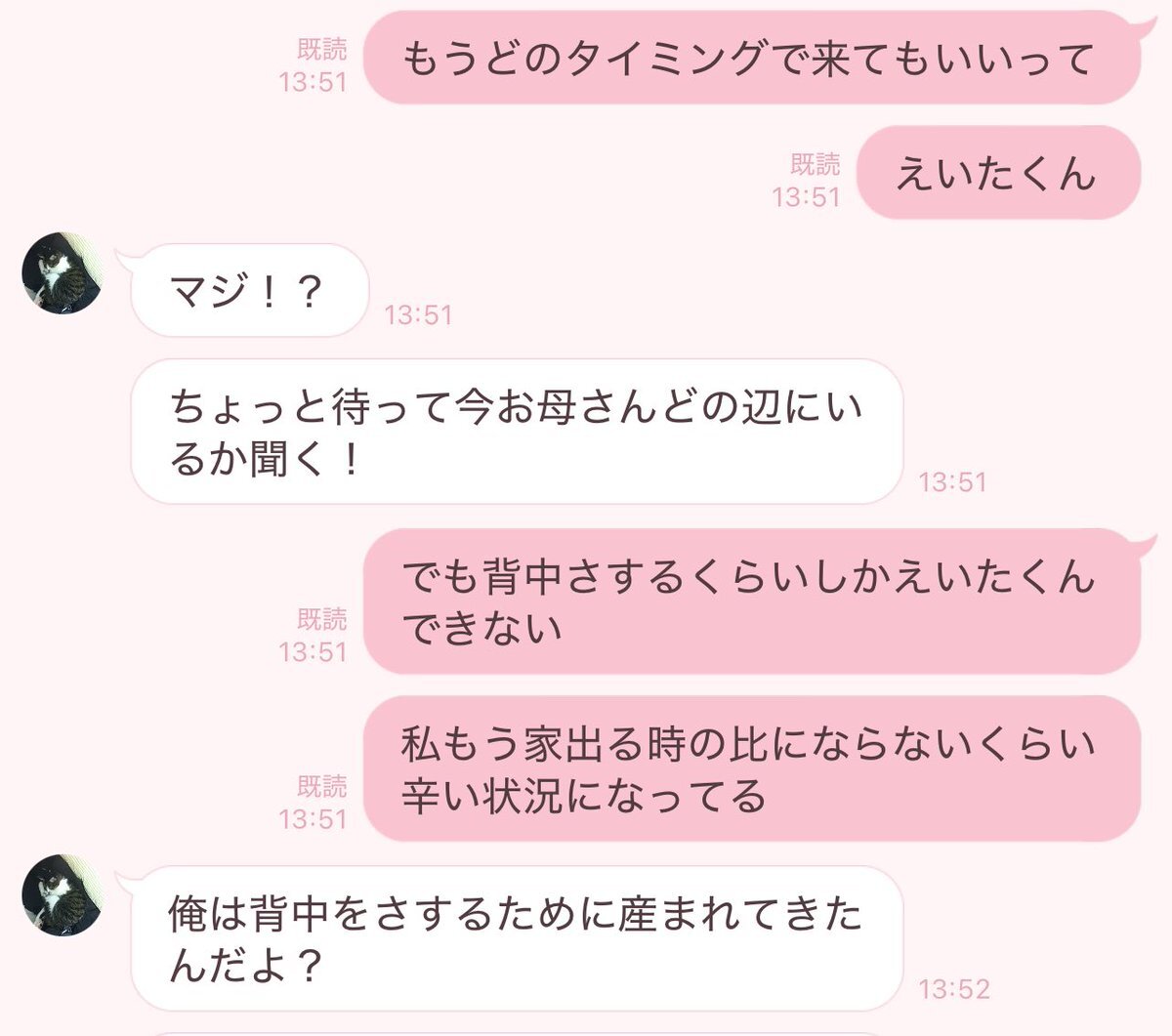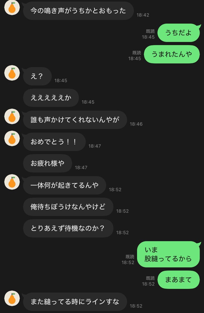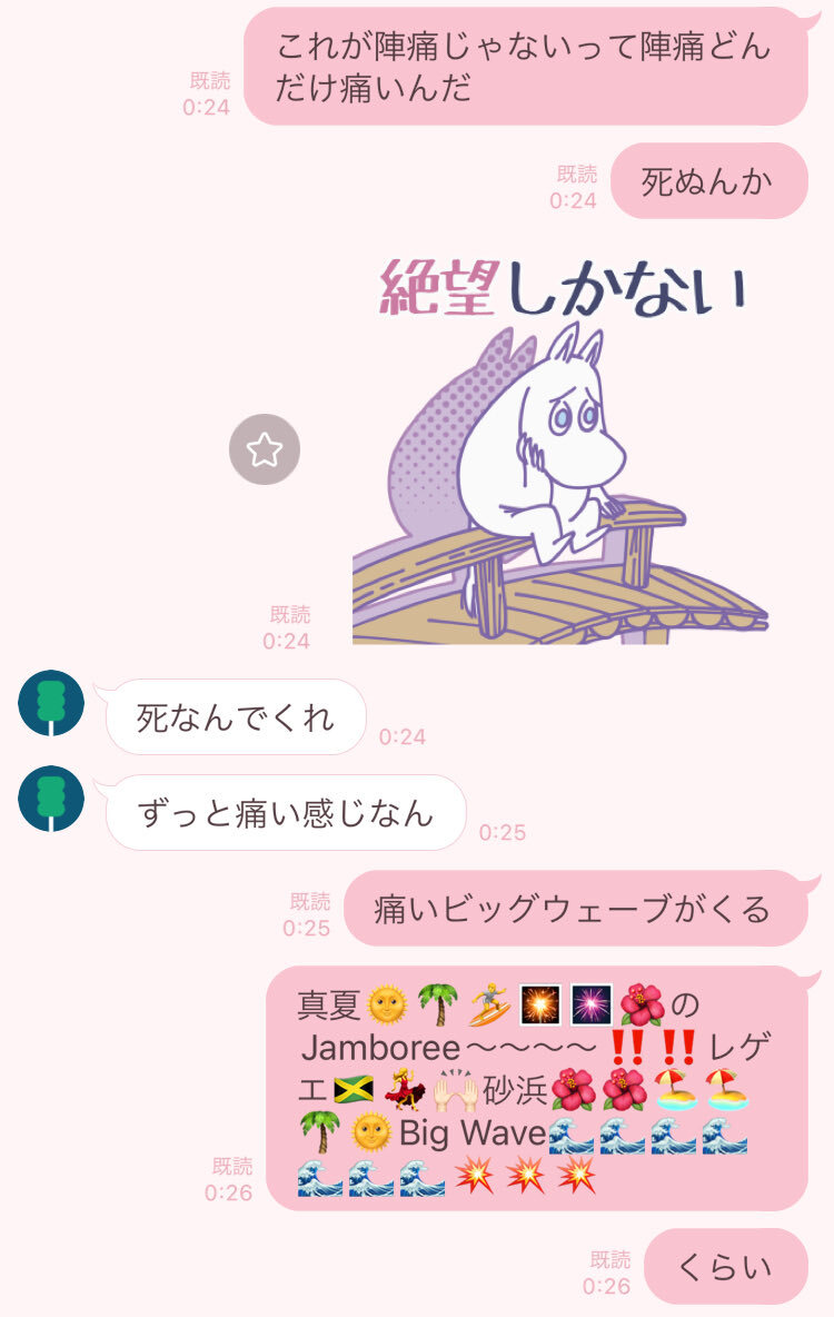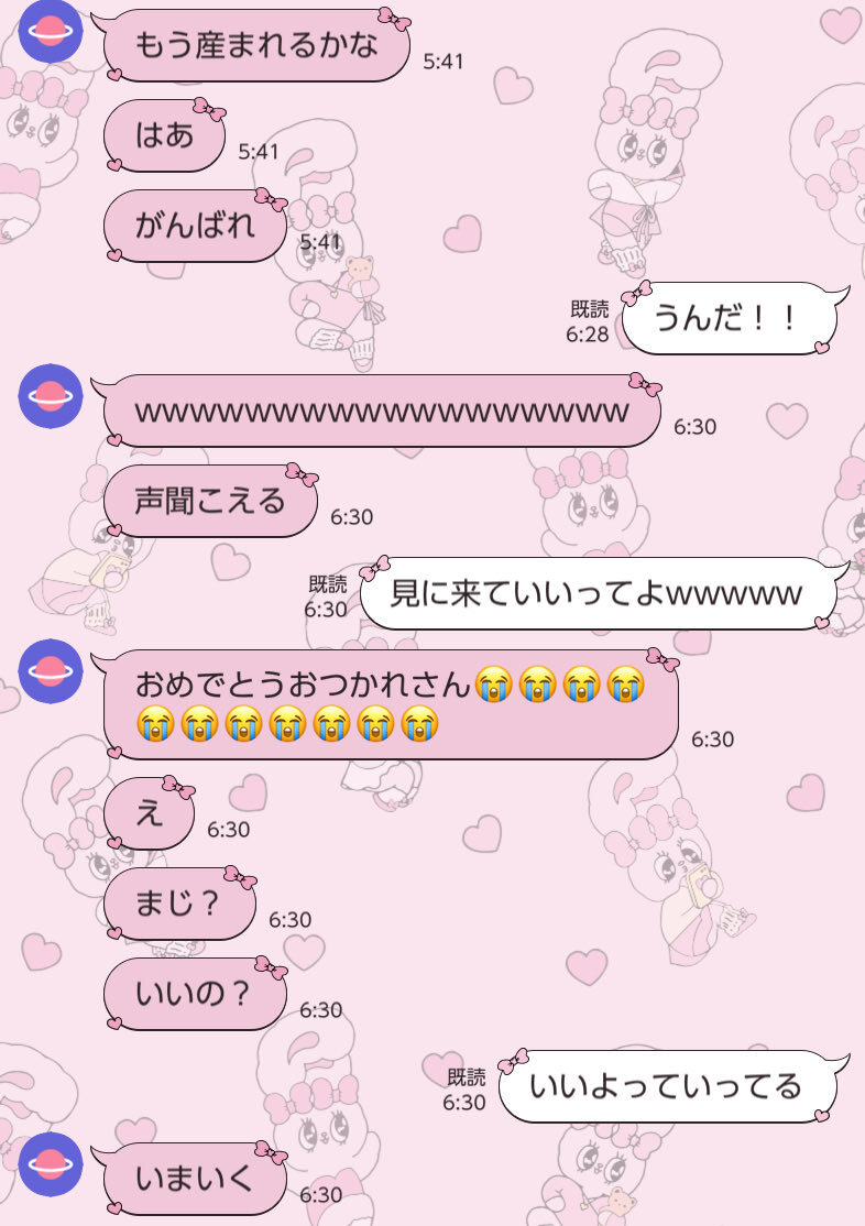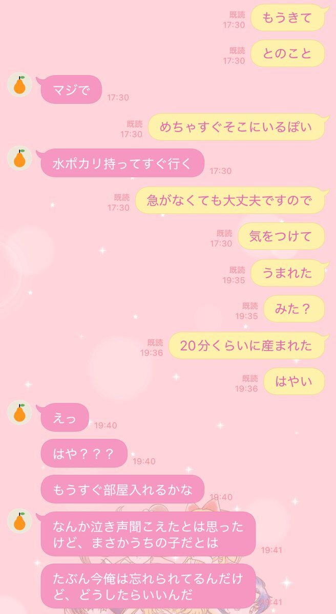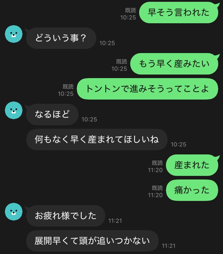 #出産日のトーク履歴 次男の時なんだけどさ👶🏻 内診した助産師さんに、 「1時間やそこらで産まれる感じじゃないけど、明るいうちには産まれると思うよ〜」 って言われてすぐ旦那に伝えたけど、10分後に産まれるっていう訳の分からない状況のトーク履歴がこちらです💁🏻♀️ pic.x.com/1Ew7OipYB0