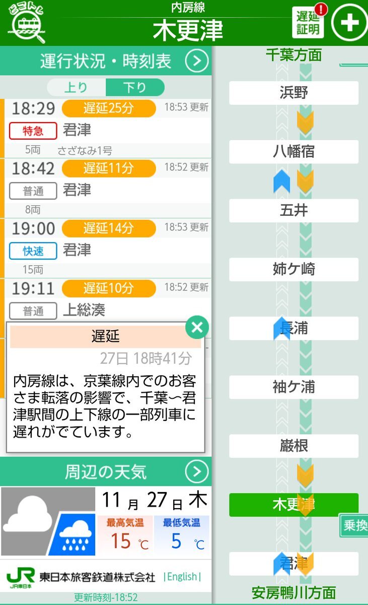 11月28日21時49分 配信 内房線:『遅延』 内房線は、外房線内での動物と衝突の影響で、安房鴨川〜木更津駅間の上り線の一部列車に遅れがでています。 #内房線 #Uchibo_Line jreast.co.jp/t_i/soubu.html