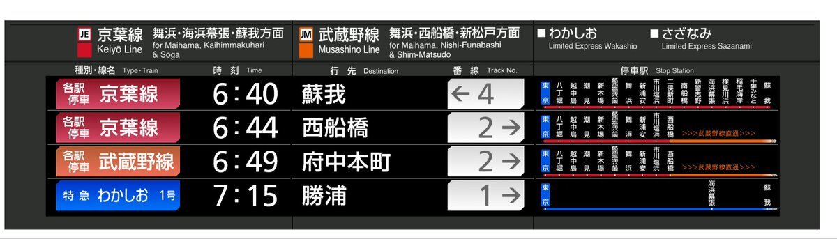 武蔵野線で海幕行かないはまあわかる。西船橋行きの京葉線、こいつが紛らわしすぎる。あとここには無いけど南船橋行きとか新習志野行きとかで手前で止まっちゃうやつも居るのが厄介。 ちなみにここに辿り着く前にそもそも京葉線のホームがどこにあるのかを見分けられないと海幕には辿り着けません!! x.com/nano_games364/…