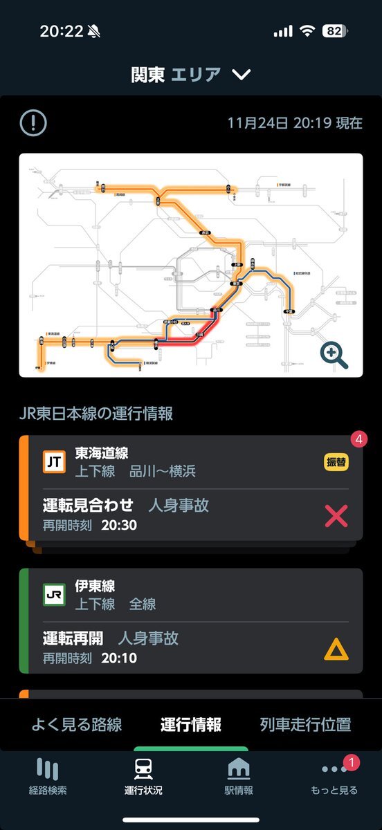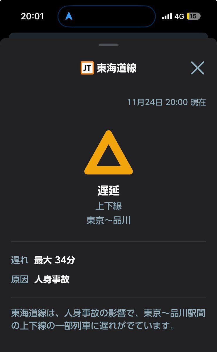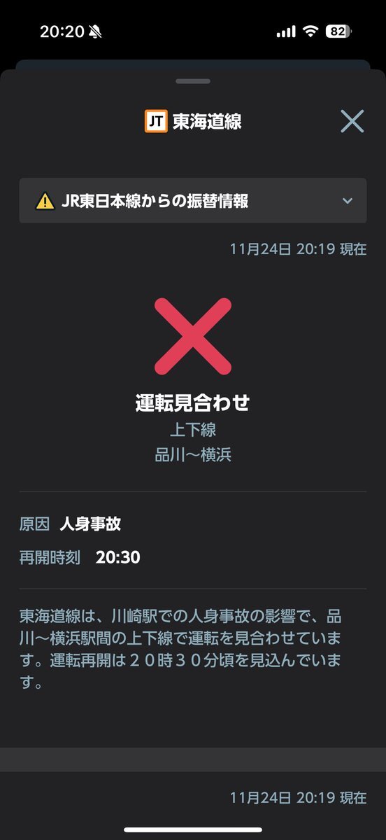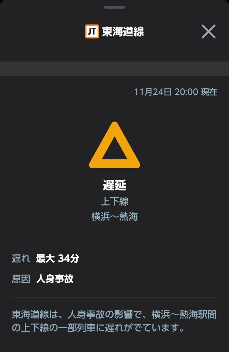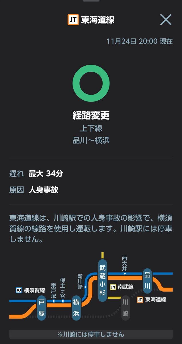東海道線は川崎駅での人身事故の影響で品川駅〜横浜駅間で運転を見合わせています。 東京駅〜品川駅間、横浜駅〜熱海駅間は運転を再開し、列車に遅れがでています。 品川駅〜横浜駅間は横須賀線の線路を経由し、川崎駅には停車せず運行しています。川崎駅へは京浜東北線か、京急線をご利用ください。 pic.x.com/8j0DcpUfNf