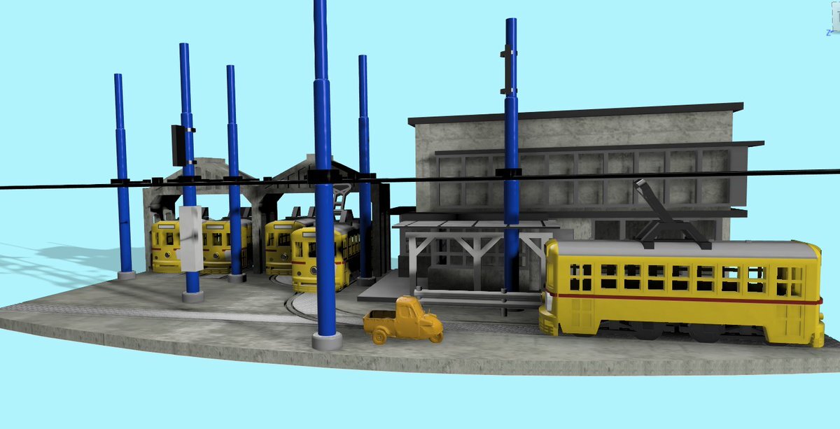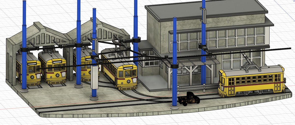 新しいおもちゃ(Bambu Lab A1 Combo)が来てしばらく作業が止まっていた都電、駒込電車車庫のジオラマ。 路面電車には必須の架線をつくってみた。 新しい3Dプリンターで架線と電柱を印刷してる。 pic.x.com/AQEwYuAGTc