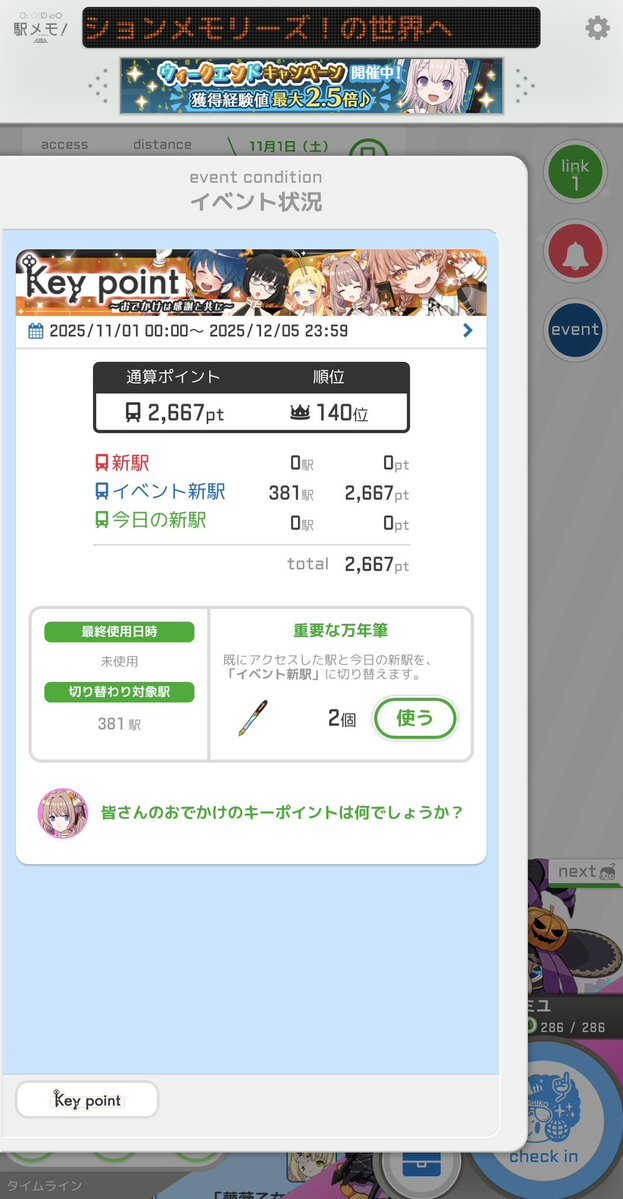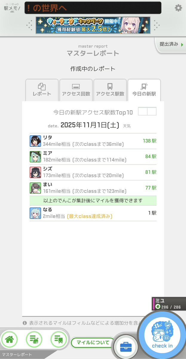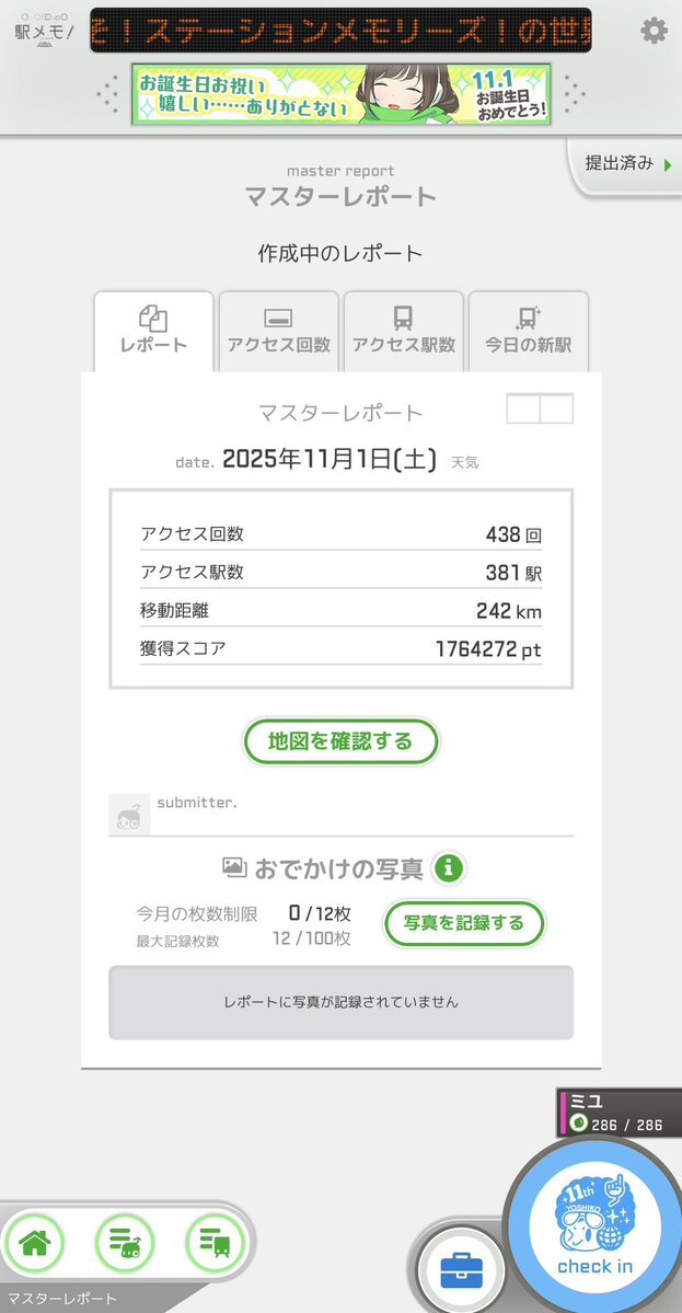 #駅メモ 11/01の五位堂&11月場所星取表 アクセス381駅…CheckIn:205,Radar:142,Rocket:34 (CI率53.81%) 残数…R565,B241,C227 というわけで新駅イベントスタート いつもの大回りと思いきや大宮から東武、そして都電でした 初日からレーダー使いすぎ感ありますが今日明日はそこまで伸びない見込み… pic.x.com/0mzh4xcNbB