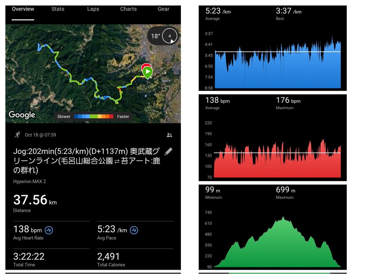 10/18(Sat) 7:59 Jog:202min(5:23/km)(D+1137m) 37.56km Hyperion MAX 2 約3年振りの奥武蔵グリーンライン (毛呂山総合公園⇄苔アート:鹿の群れ) 山の猛者達とだったので終盤は遅れそうになるも、何とか無給水で完遂 豚ヒロ@鶴ヶ島でリカバリー アフターのサイゼで山の猛者+1名&5時間滞在の宴会 pic.x.com/eM68T7tezV