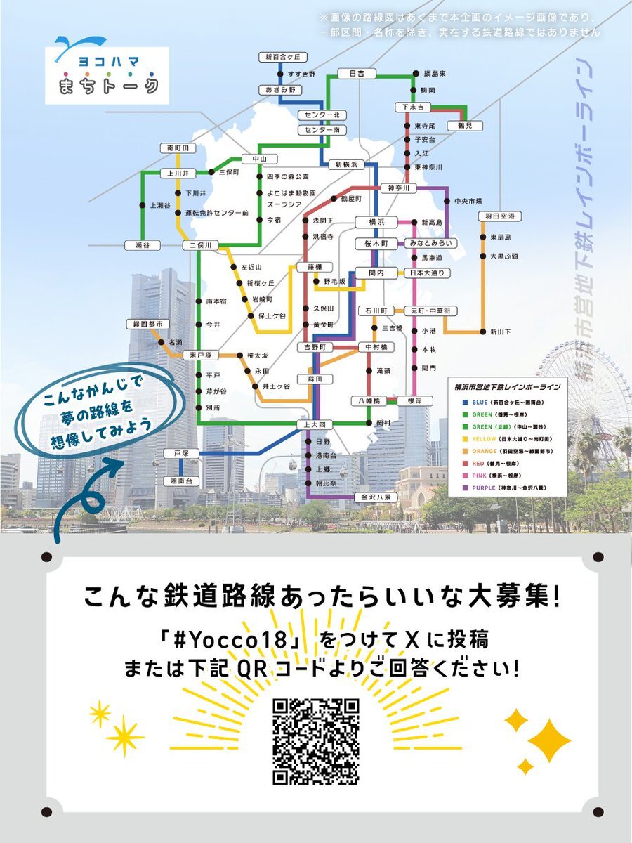 【こんな鉄道路線あったらいいな】を大募集! 次回10月26日(日)配信のヨコハマまちトークでは、「架空の鉄道路線」をテーマに話し合います! みなさまから寄せられたコメントを紹介させていただきますので、ぜひご回答いただければ幸いです! 回答は、#Yocco18 のほか、以下のフォームからどうぞ!