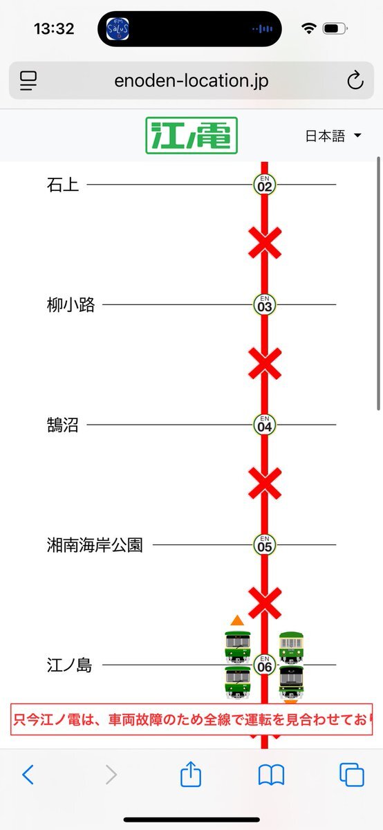 2025/11/24(月)#江ノ電運用 #なうえの 13:13:49の公式お知らせ欄 藤沢~鎌倉駅間運転見合わせ表示 只今江ノ電は、車両故障のため全線で運転を見合わせております。ご迷惑をお掛けして、申し訳ございません。
