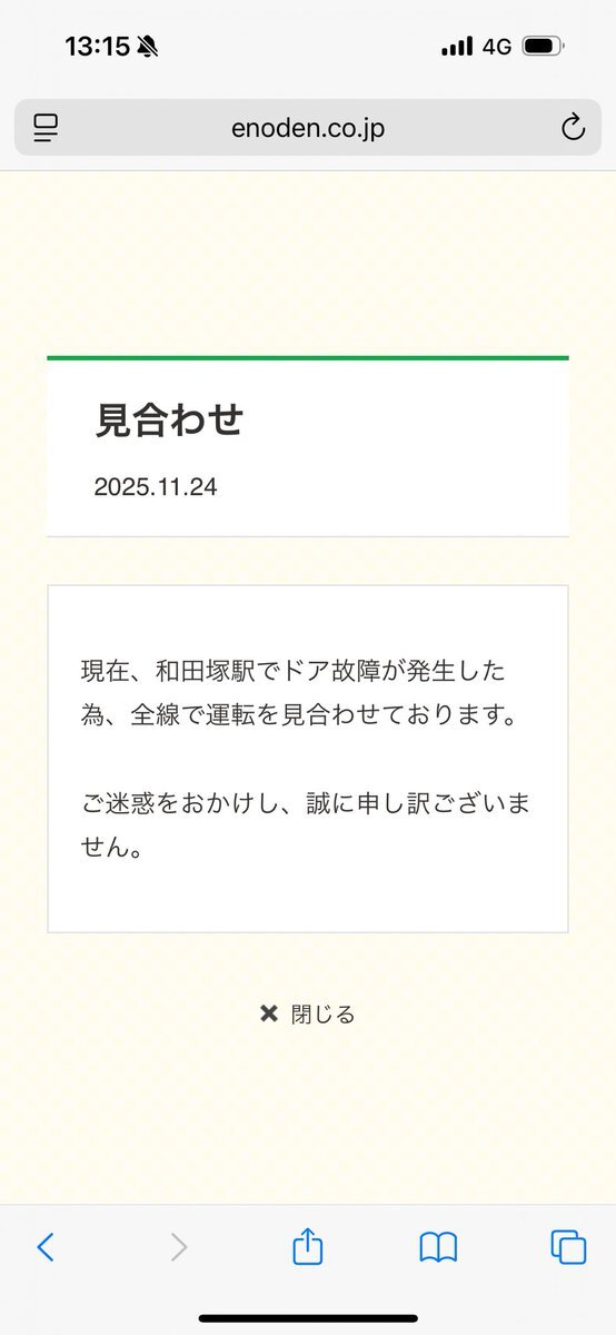 2025/11/24(月)#江ノ電運用 #なうえの 13:40:11の公式お知らせ欄 ただいま江ノ電は、車両点検の影響で遅れております。ご迷惑をおかけして申し訳ございません。