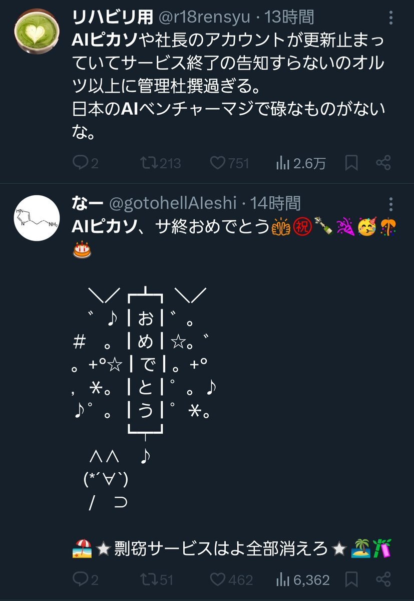 絵師や反AIの意見に寄り添ってクリーンなAIの開発を続けていたAIピカソ、サ終の発表と同時にこの暴言…酷いことやでこれは…… ミツアもサ終したら同じ目に遭わされるんだろうな pic.x.com/MgLJXylsWG