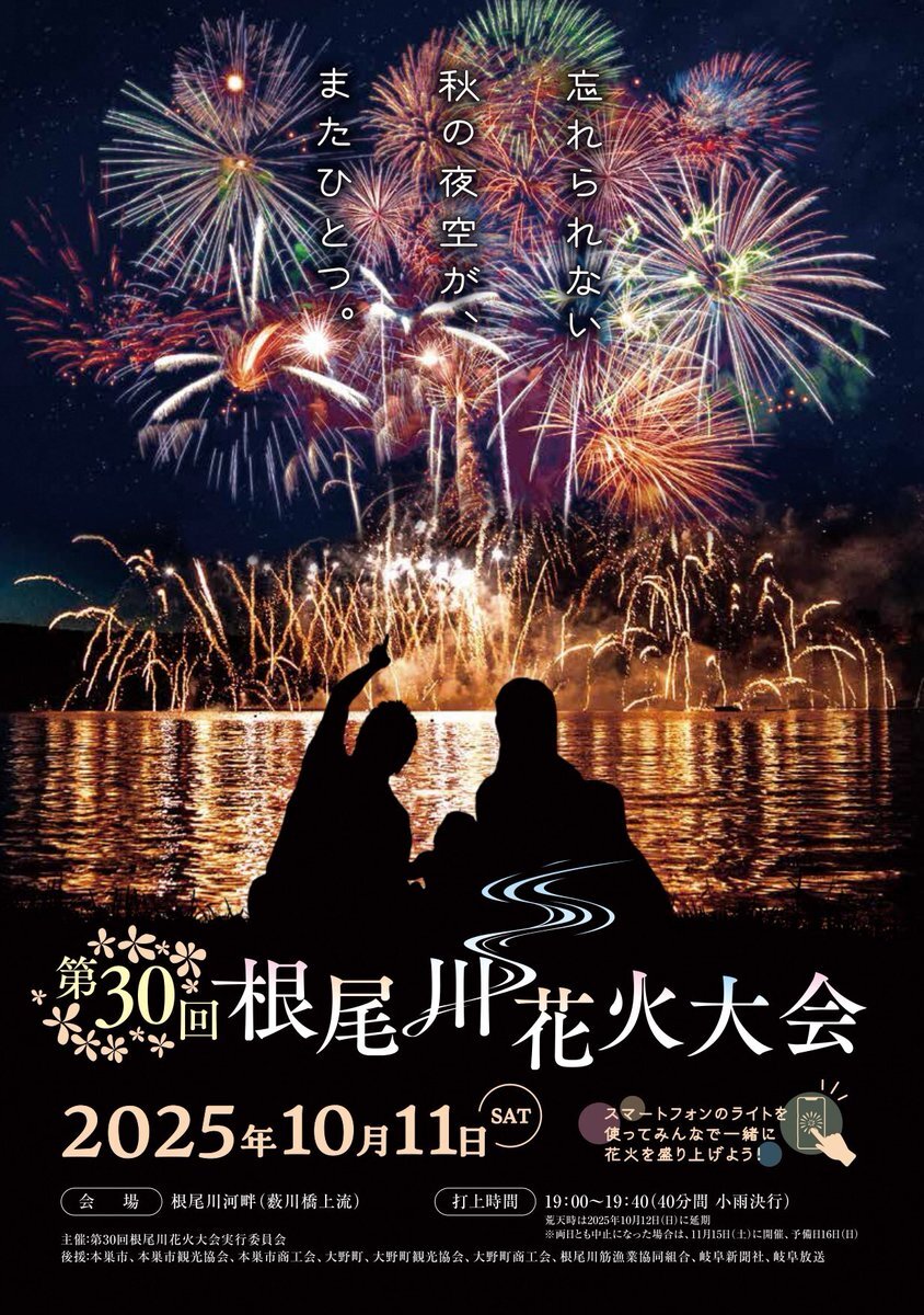 第30回根尾川花火大会 大野町HP 9/8更新 town-ono.jp/0000002094.html 令和7年10月11日 根尾川河畔 薮川橋上流 キービジュ めちゃ綺麗! 本巣市側 広範囲で見える モレラ岐阜 予想より近いよ 大野町側 広範囲で見える 堤防に上がれるなら◎ ※近況不明🙇昔と違うかも※ 尊守 立入禁止区域 交通規制 pic.x.com/ghyKX0yCJl