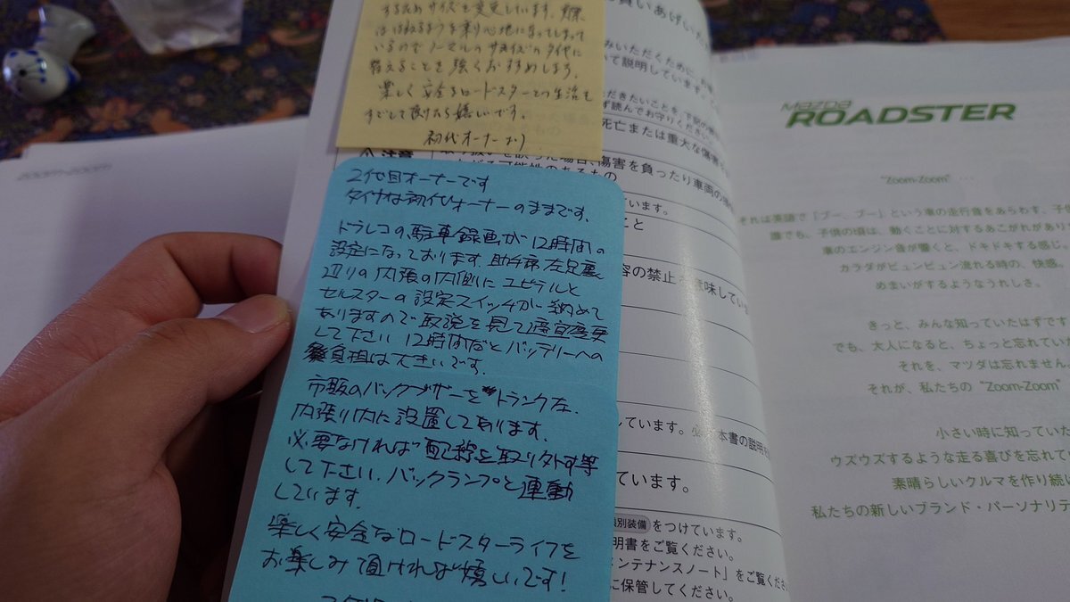 突然申し訳ありません。初代オーナーです。普段、Xはほとんど使ってませんが、たまたま開いたら自分の手書きの文字が…。こんなことってあるんですね(笑)。 2代目の方にも大切に乗って頂いたようで、幸せな車だと思います。 ロードスターと素敵な時間を過ごして頂けたら嬉しいです。
