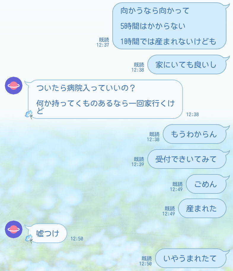 #出産日のトーク履歴 次男の時なんだけどさ👶🏻 内診した助産師さんに、 「1時間やそこらで産まれる感じじゃないけど、明るいうちには産まれると思うよ〜」 って言われてすぐ旦那に伝えたけど、10分後に産まれるっていう訳の分からない状況のトーク履歴がこちらです💁🏻♀️ pic.x.com/1Ew7OipYB0