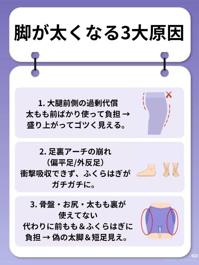 これが「脚が太くなる3大原因」なんだって。逆に言えば、原因に合わせて 整えてほぐして使うだけ で脚は細くなる。1分ずつやるだけで前ももの張りやふくらはぎのゴツさがスッと消えていくよ。 pic.x.com/6xcqX8lVUH