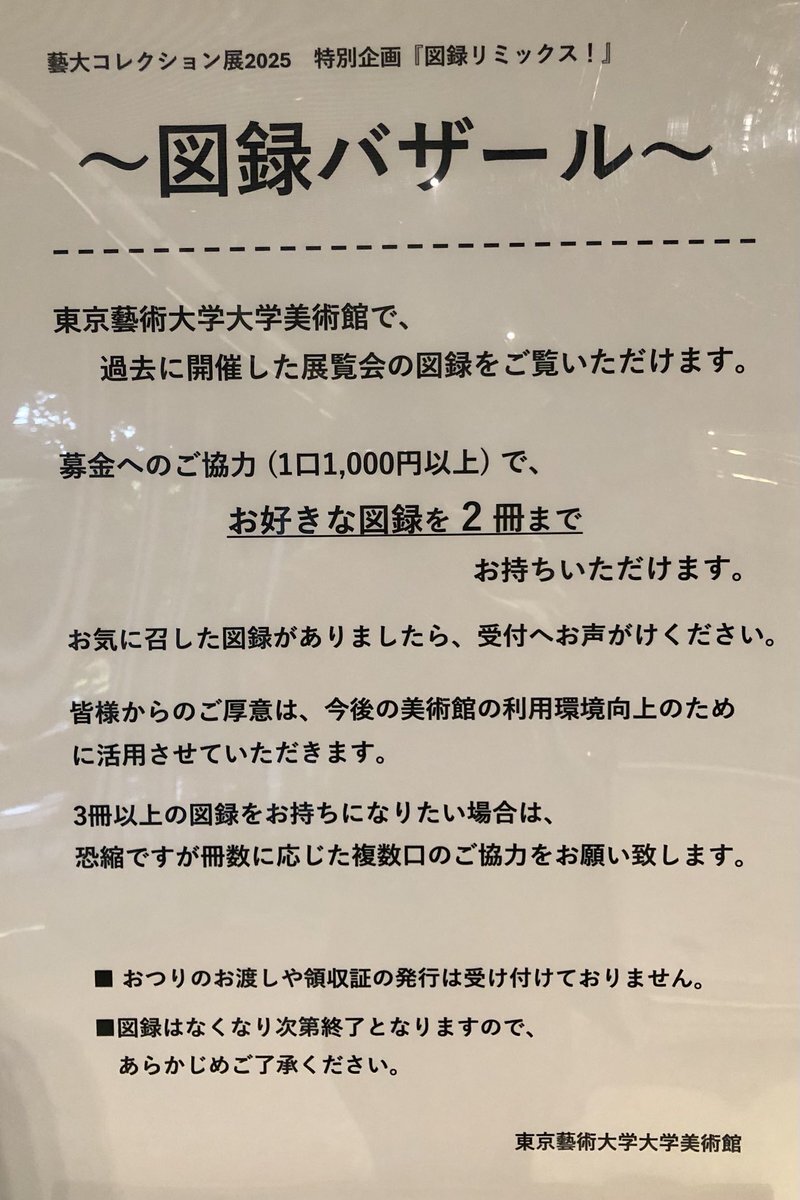 藝大美術館の受付前で 「1000円以上の寄付で好きな図録を2冊もらえる」 という不思議な会(?)がひっそり行われていた。わたしは「契丹」(すごく好み!)と「法隆寺」(この頃興味が向いているけど全く知識ないから勉強したい。。)をほくほくといただいてきました。 pic.x.com/CKr0DZJ4vA