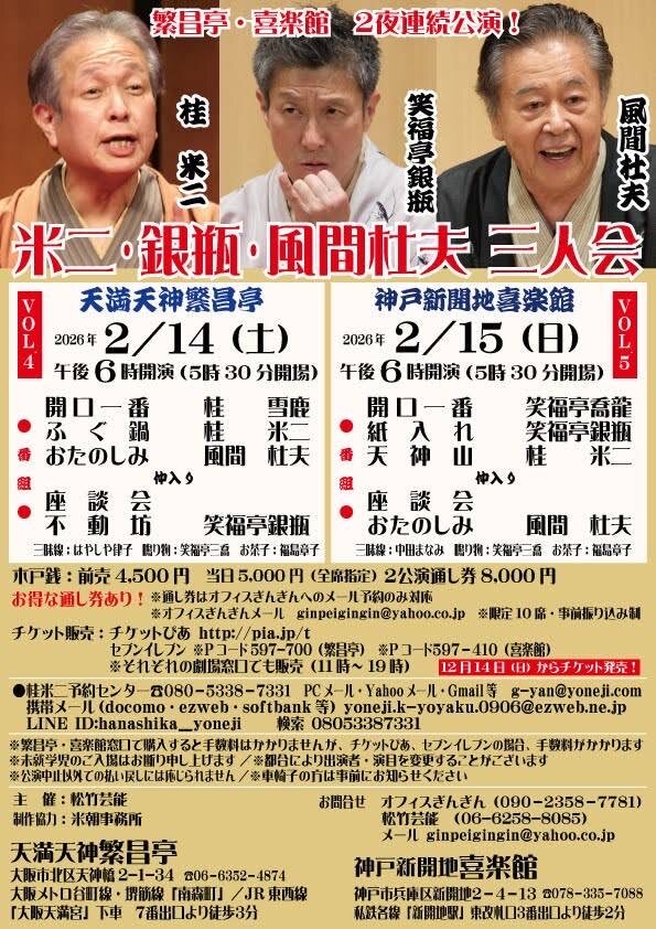●米二・銀瓶・風間杜夫 三人会 12月14日(日)チケット発売‼️ ①2月14日(土)大阪・繁昌亭 ②2月15日(日)神戸・喜楽館 どちらも午後6時開演😊 お得な通し券もあります。 #風間杜夫 #桂米二 #笑福亭銀瓶 pic.x.com/tWTbEEmg9S x.com/ginpeigingin/s…