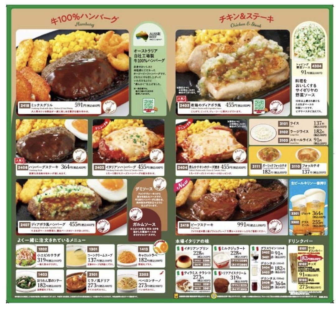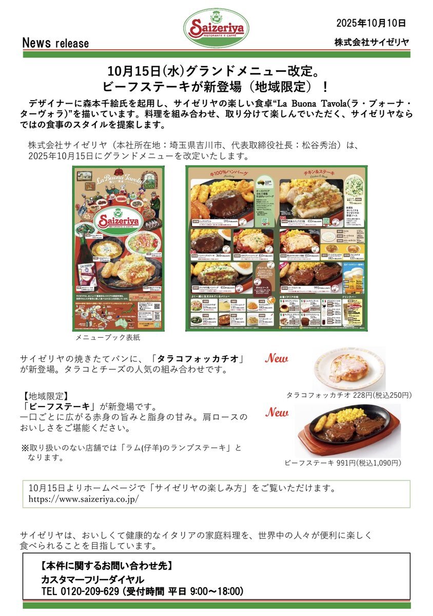 【超速報】サイゼリヤの新メニューが10/15(水)からスタートしますよー! タラコフォッカチオが全国で食べられる! ビーフステーキは地域限定!! ラムのランプステーキが復活!!! イタリアンハンバーグから目玉焼きが消える!!!! 柔らかチキンのチーズ焼きがリニューアル!!!!! #サイゼリヤ pic.x.com/GA0AMWbDxo