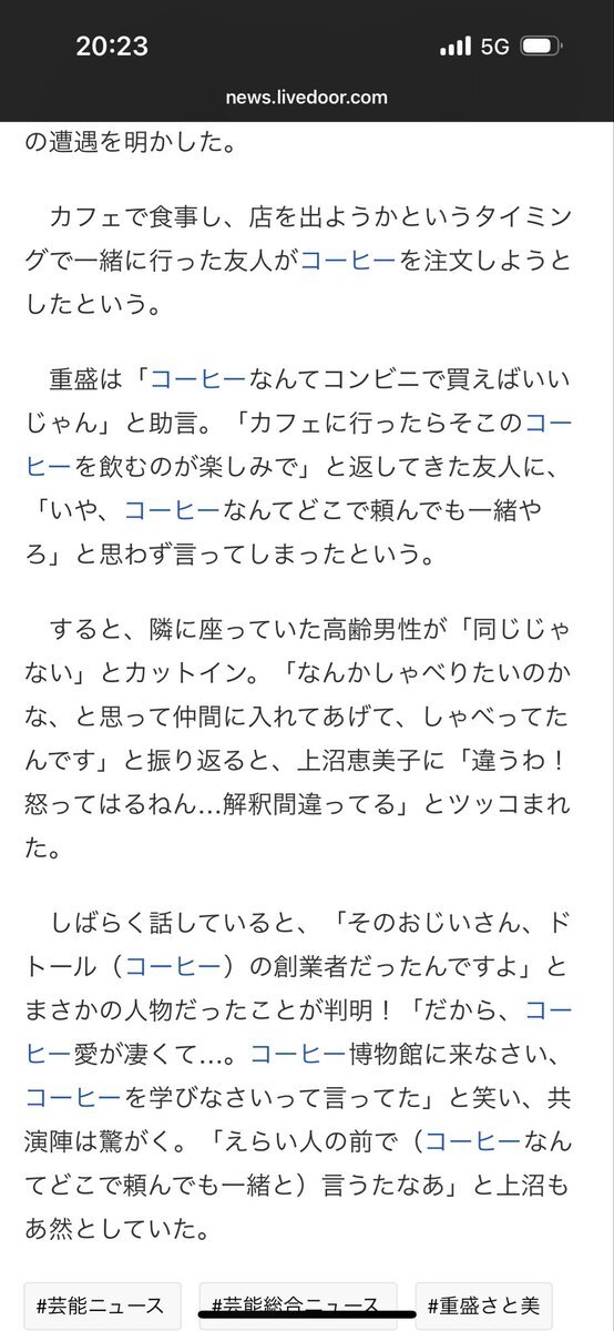 【!?】重盛さと美「コーヒーはどこで頼んでも一緒」→反論してきた老人、まさかの人物だった news.livedoor.com/article/detail… 重盛はカフェでコーヒーを注文した友人に「コーヒーなんてどこで頼んでも一緒」と発言したところ、隣の高齢男性が「同じじゃない」とカットイン。男性はドトールの創業者だった。 pic.x.com/fQcW5VWaWy