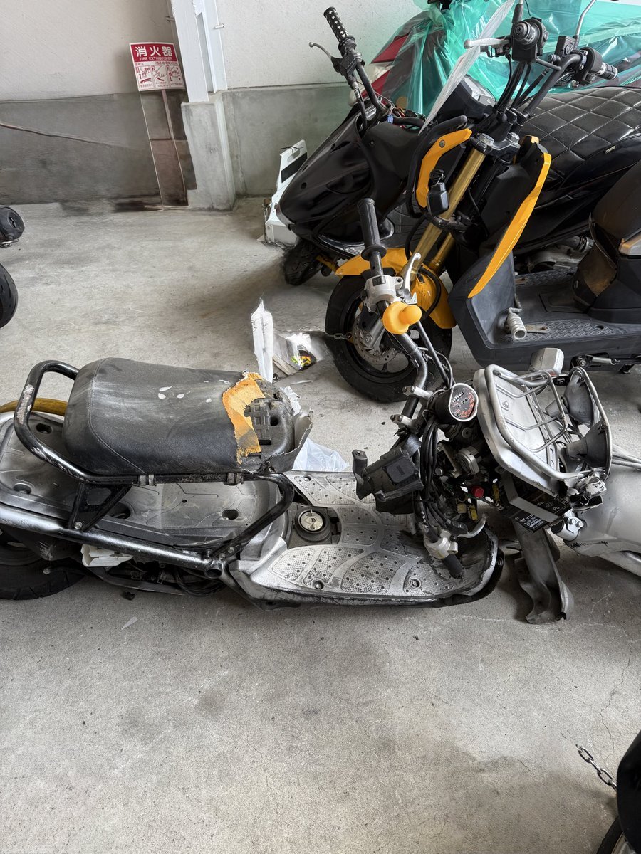 娘が駅前の駐車場に停めてたバイクが盗難にあった。 盗難届を出して何ヶ月か経った頃 警察から電話があった。 娘さんのバイクが見つかったので取りに来てください。 いったらこれだった。 スプレーで色塗られてて、全く別物になってた。車との接触事故で盗難車と発覚。乗ってた子は中学生の男子だった pic.x.com/SgtKm4giXF