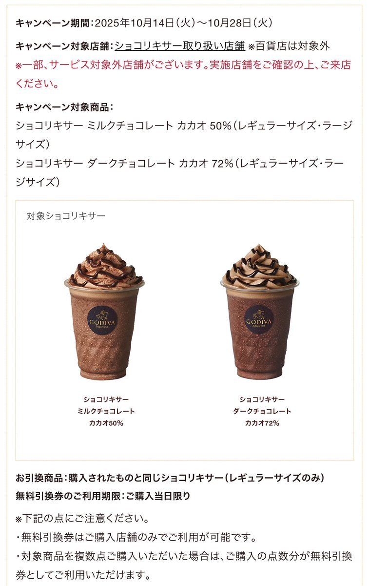 きたー!GODIVA対象の「ショコリキサー」1個買うともう1個無料!!超ウマいのに高くてなかなか飲めないけど、1個分の価格で2個買えるなら実質半額!764円→382円と喫茶店のコーヒーより安い。10/14〜28まで! pic.x.com/rtIyQHHyN3