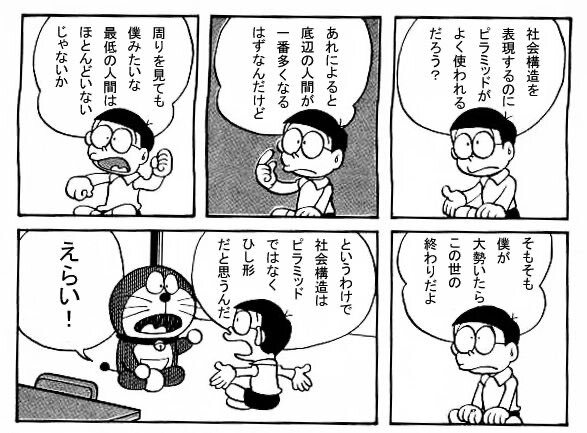 社会構造ピラミッドは単に能力の高さ低さを表しているわけじゃなくて収入や社会的地位と引き換えに自由時間を得る人などもいて「上に行くには努力したり相応のコストが必要で下のほうに留まる場合の難易度は低い」から底辺になるほど割合が多くなるってだけの話かと思います。