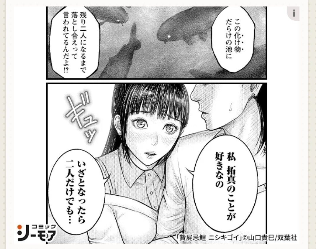 せっかくだから本編をみんなで読もう(グロ注意とのことなので気を付けてね) 第1話 鯉 / 贄屍忌鯉 ニシキゴイ - 山口貴巳 | webアクション [ comic-action.com/episode/255091… ]