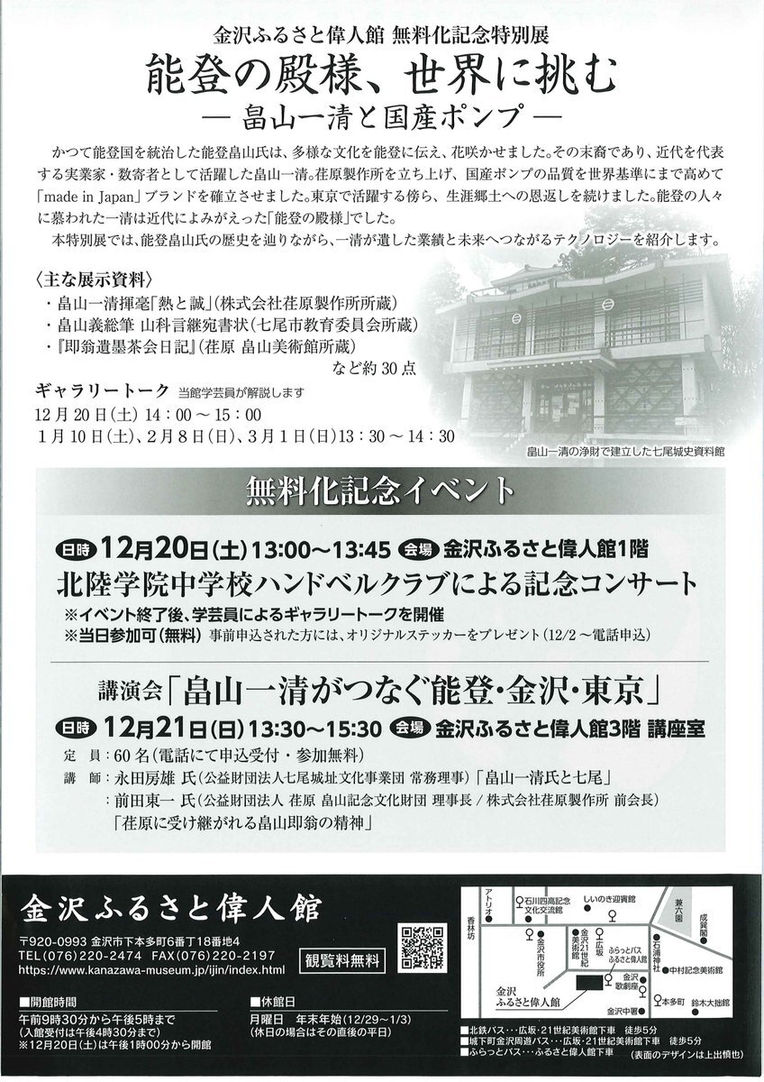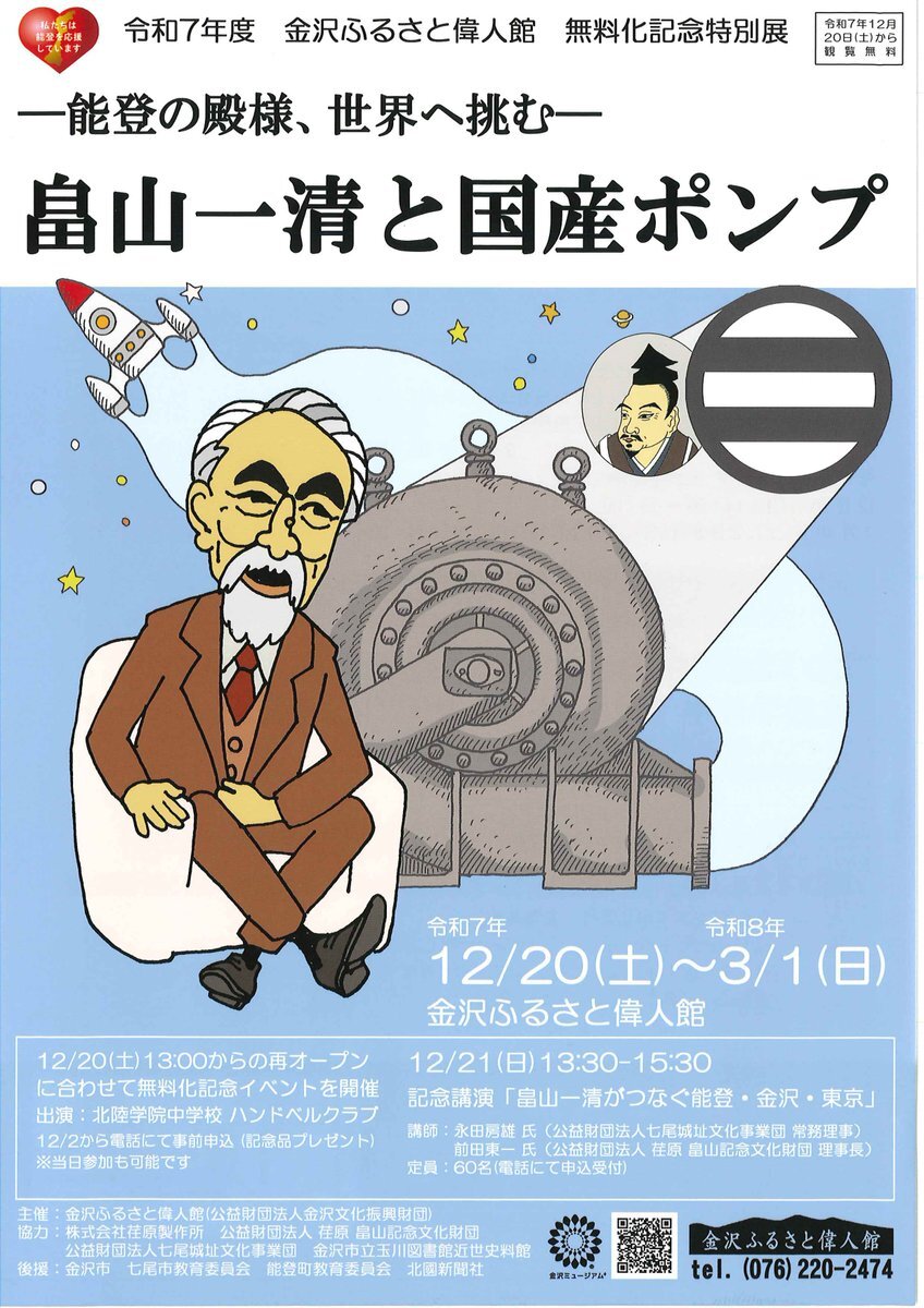 \兼六園周辺 文化の森/ 金沢ふるさと偉人館が、12/20㈯より再開館🎶 特別展示「能登の殿様、世界に挑む―畠山一清と国産ポンプ―」が開催されるほか、観覧料金無料化を記念して、北陸学院中学校ハンドベルクラブによる記念コンサートなどの関連イベントも行われます🔔😊 kanazawa-museum.jp/ijin/index.html pic.x.com/OWE8RmFrOA