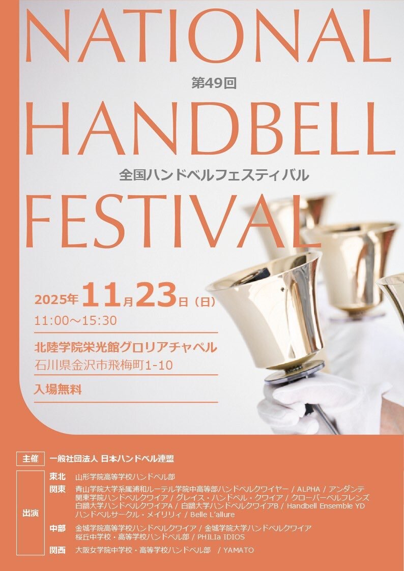 第49回全国ハンドベルフェスティバルは、11月23日(日)北陸学院栄光館グロリアチャペルにて開催いたします。 北陸の地でハンドベルの音色が響きます。 参加される皆さま、聴きにいらっしゃる皆さまお気をつけてお越しください🔔 みなさまにお会いできるのを楽しみにしています。handbell.jp pic.x.com/XPj7KYotT2