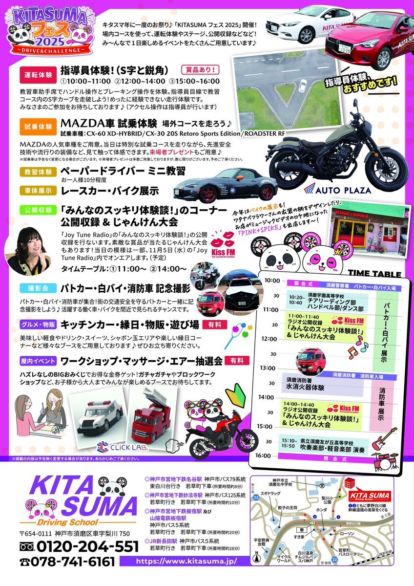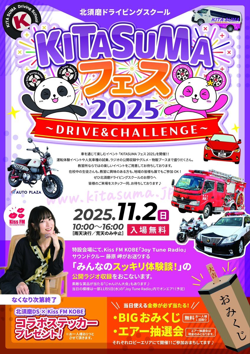 今年も開催します! KITASUMAフェス2025👏 11月2日(日) 10:00〜16:00 会場:北須磨ドライビングスクール 雨天決行/荒天中止 詳しくはホームページをご覧ください #kitasuma_ds #KissFMKOBE pic.x.com/scG2zHiXKK