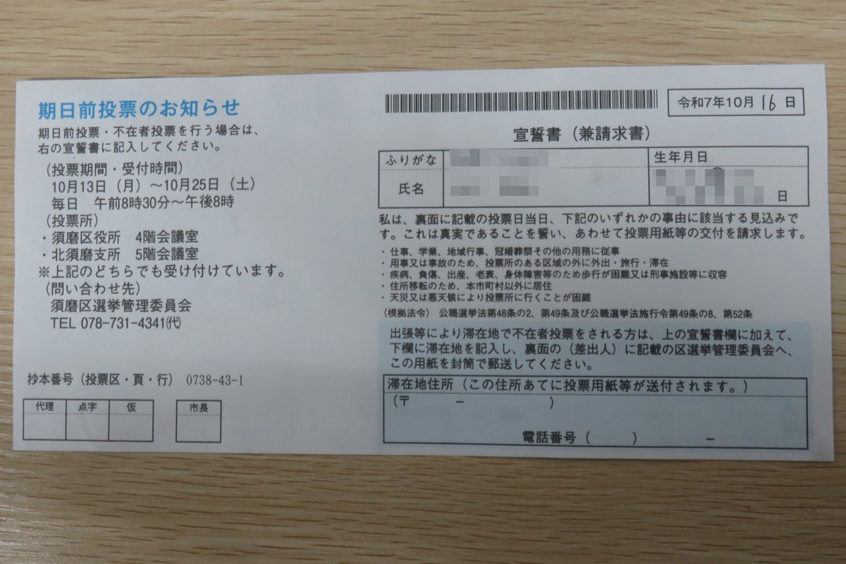 神戸市長選挙 期日前投票に行って来ました - きんちゃんのぷらっとドライブ&写真撮影 kinchan0701.hatenablog.com/entry/2025/10/… 届いていた投票の案内の裏面の宣誓書にあらかじめ記載しておきます。 北須磨支所に行きます。 期日前投票所は北須磨支所の5階です。 エレベーターの中にも案内があります。 pic.x.com/e2zTlQcFf3