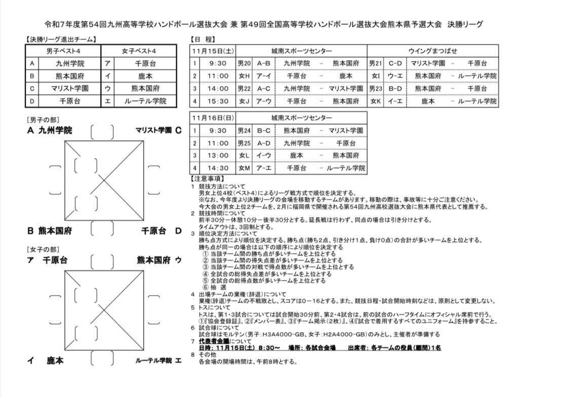 九州選抜予選決勝リーグ最終日 第4試合前半終了 男 熊本国府25(9-19,16-17)36マリスト 男 九州学院25(12-20,13-19)39千原台 女 鹿本16(7-13,9-14)27熊本国府 女 千原台(12-11,-)ルーテル