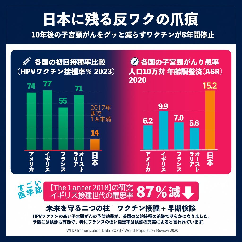 1997.4.2~2008.4.1生まれの女性で、HPVワクチンを1回接種済の方は、後追い無料接種(2回目)の期限が今年の12月だそうです!反ワクに殺されないためにも接種継続をご検討ください! 出展 初回接種率:WHO Immunization Data 子宮頸がん罹患率:World Population Review 厚労省mhlw.go.jp/content/109000… pic.x.com/l5OeTHoX1j