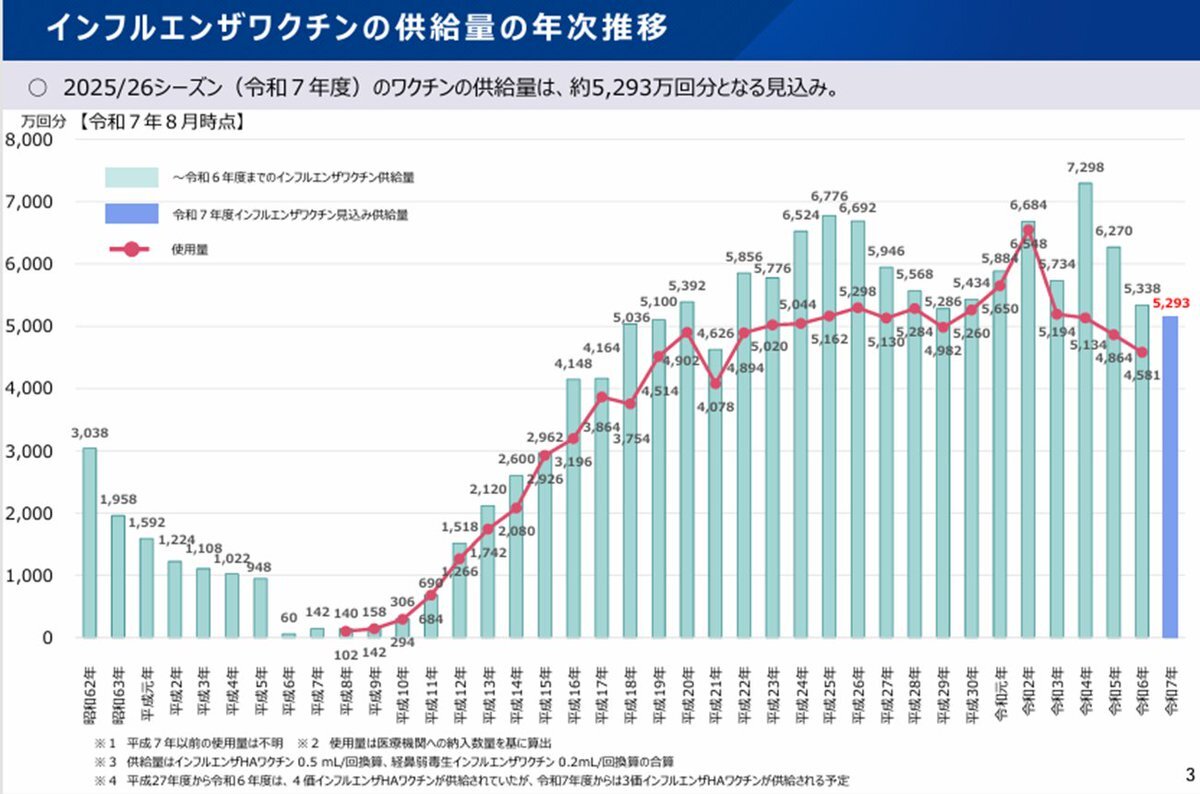 返信先:@shi_ge1115他1人これは厚労省資料からの抜粋ですが、今年は約5,293万回分の在庫は確保するようです。 昨年度は約4,581万回分使用なので、インフルワクチンの接種率は約36.7%と依然高い状況だということに驚きました😅 pic.x.com/oS763d6JLE