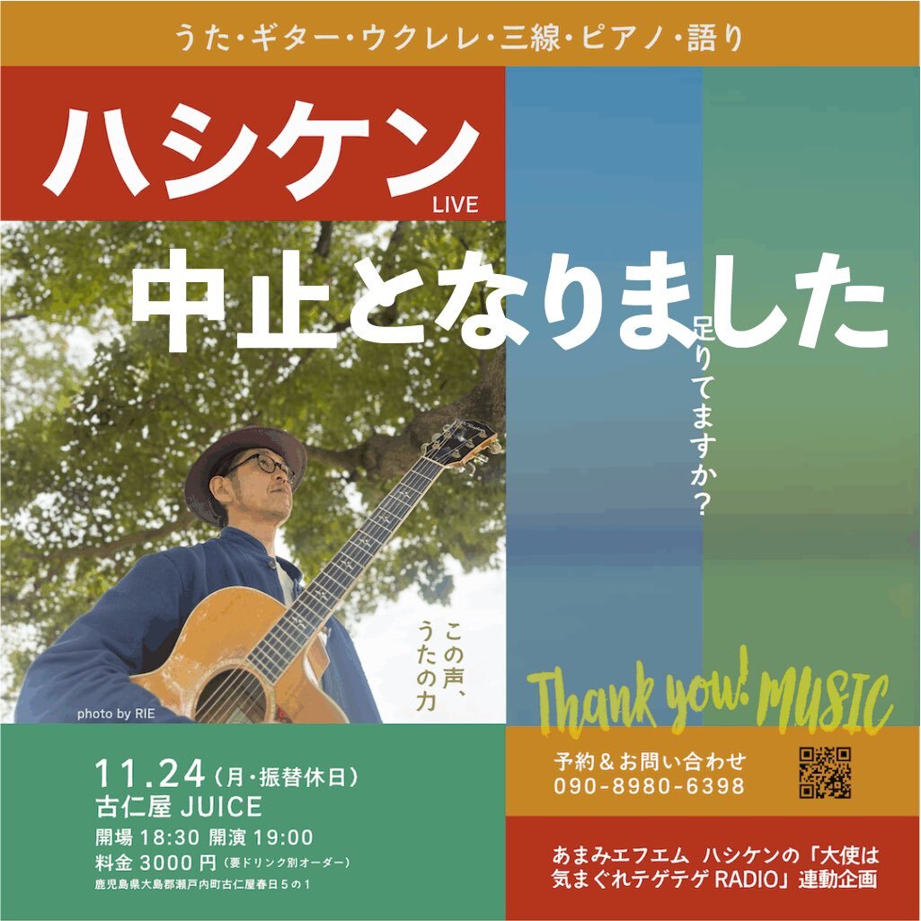 【中止となりました】本日の古仁屋JUICE でのソロライブは喉の調子が良くない状態で、歌うことができないので、とても残念なのですが、中止とさせていただきます。楽しみにされていた皆さん、大変申し訳ありません。また来年あらためてJUICE でのライブを考えます。次の機会にぜひ!ハシケン pic.x.com/CTWX93Lzal